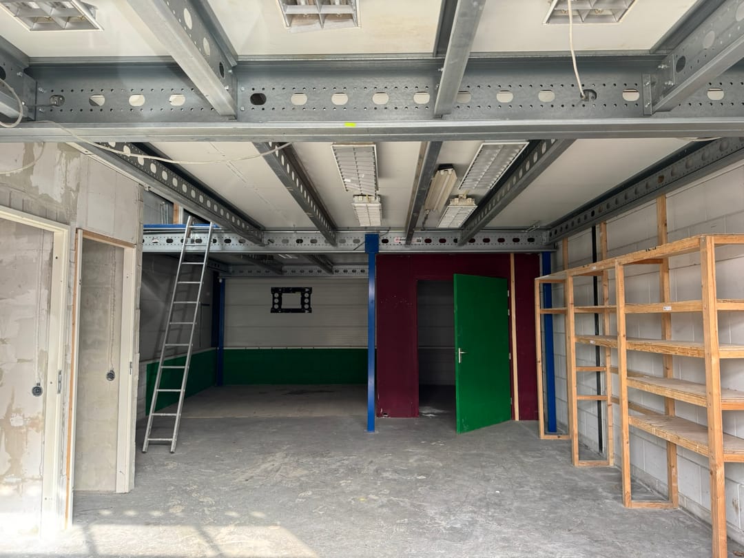 - handbedienbare overheaddeur van ca. 3,50 meter breed en ca. 5,00 meter hoog, voorzien van lichtdoorlatende segmenten;