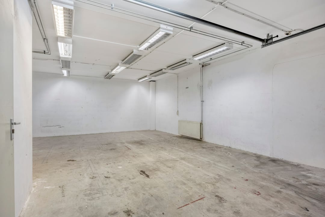 - Overheaddeuren, betonvloer, toilet, pantry, inbouwarmaturen en te openen ramen