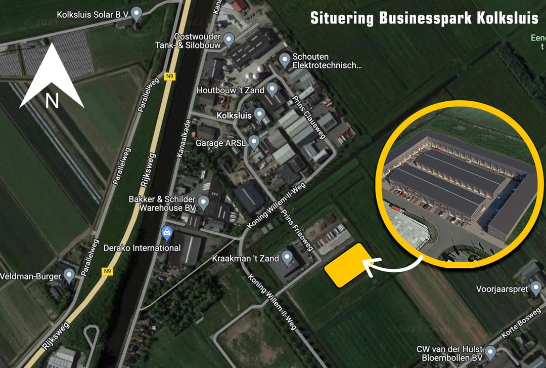 Bedrijvenpark Kolksluis kent een uitstekende strategische ligging. Het park bevindt zich op circa twee minuten rijafstand van de N9, waardoor belangrijke plaatsen in de regio goed bereikbaar zijn.