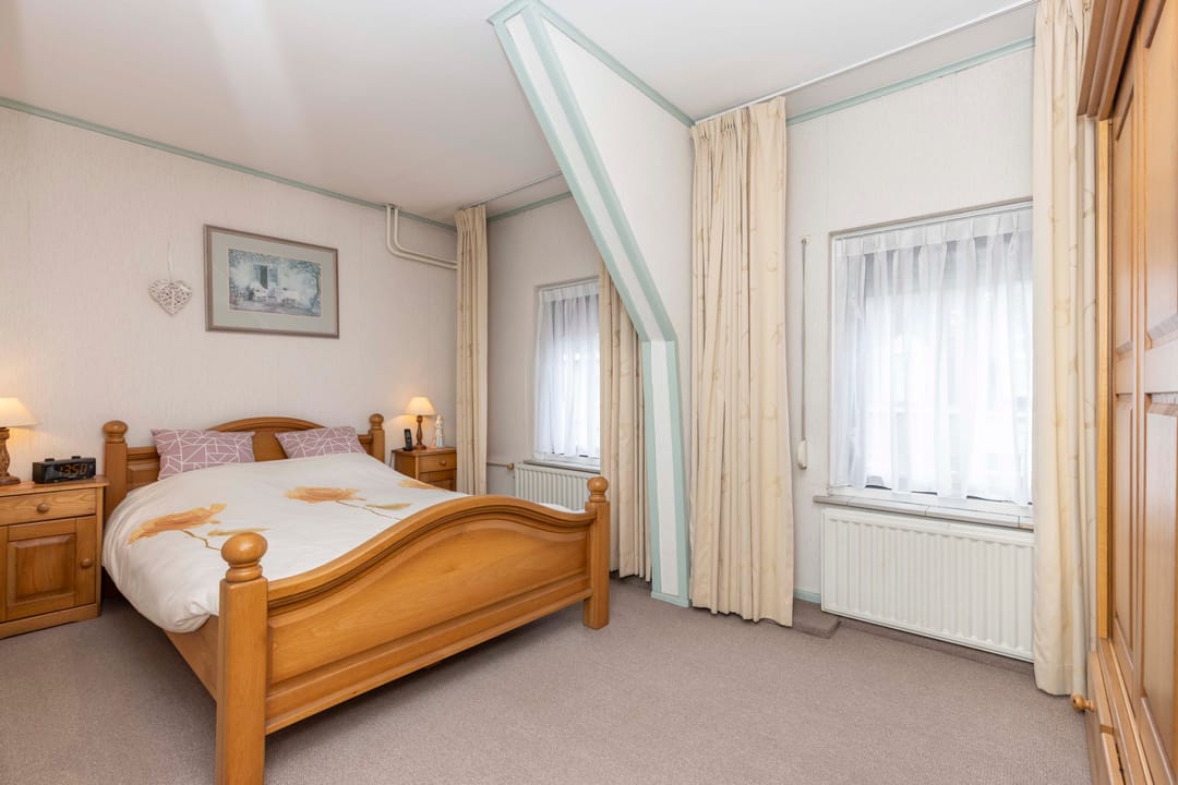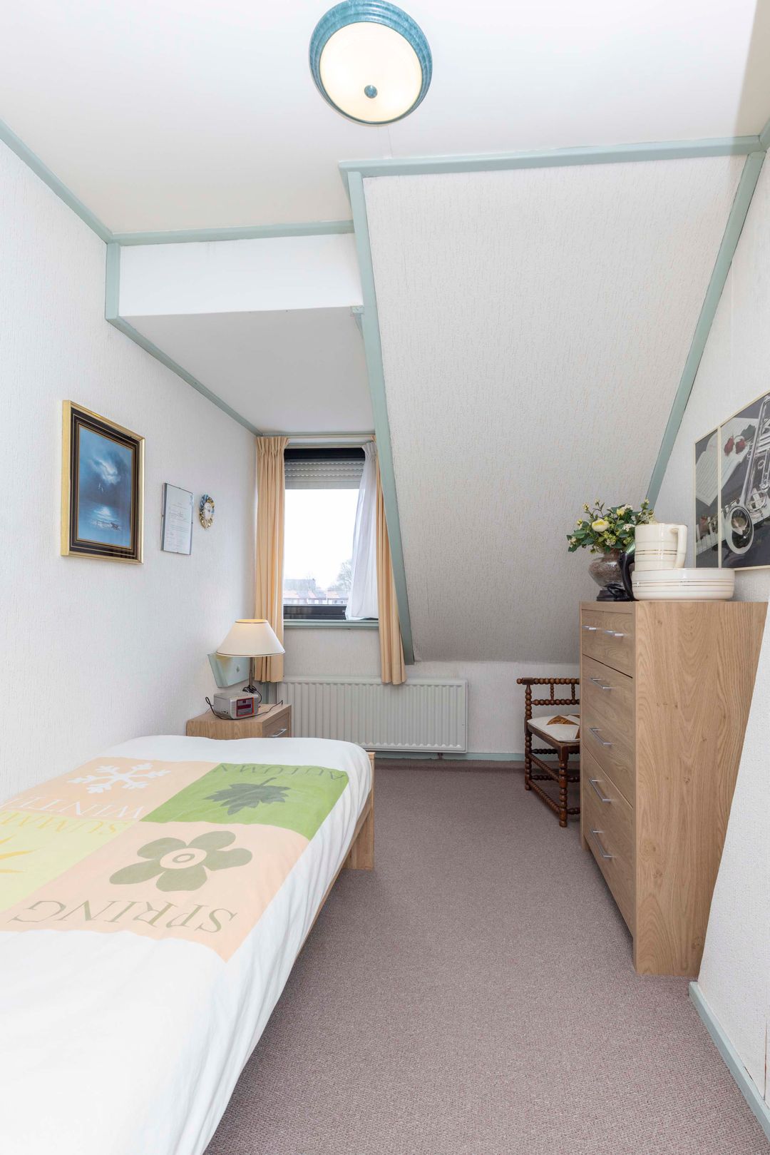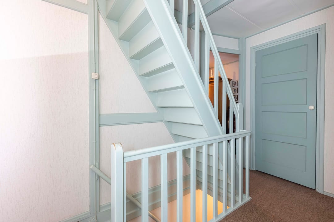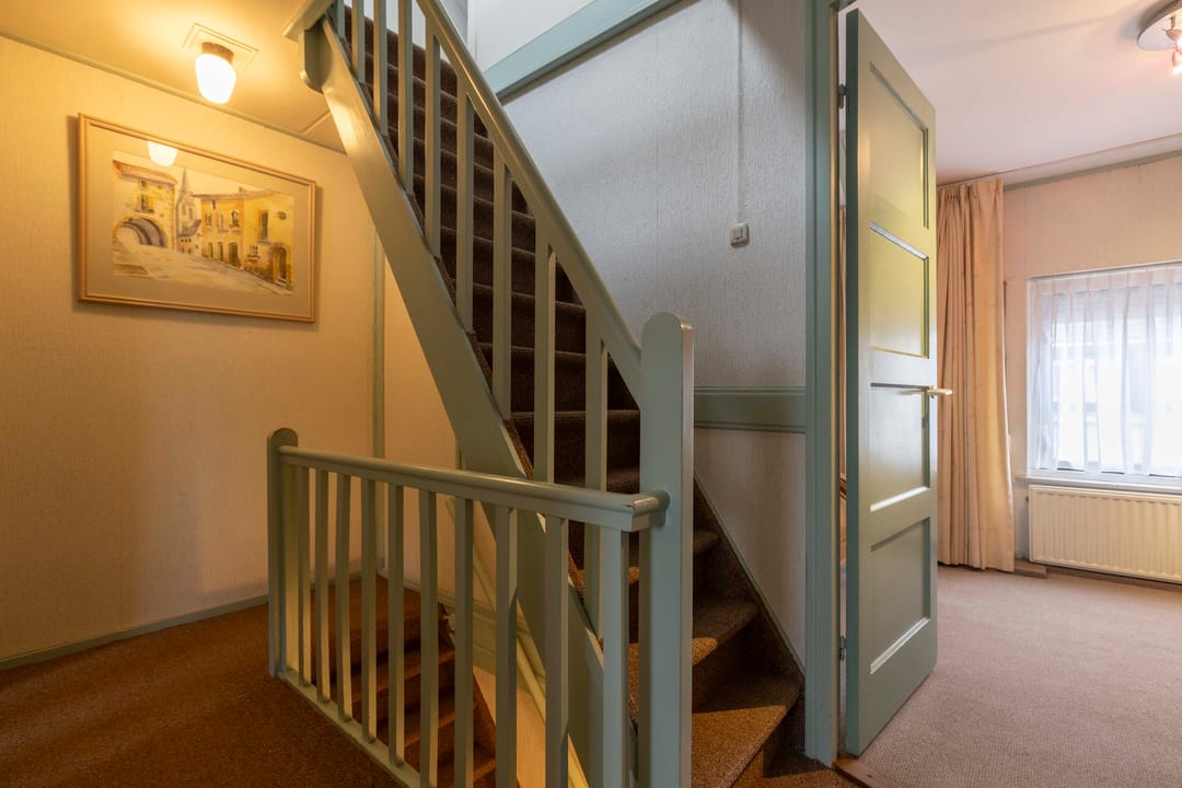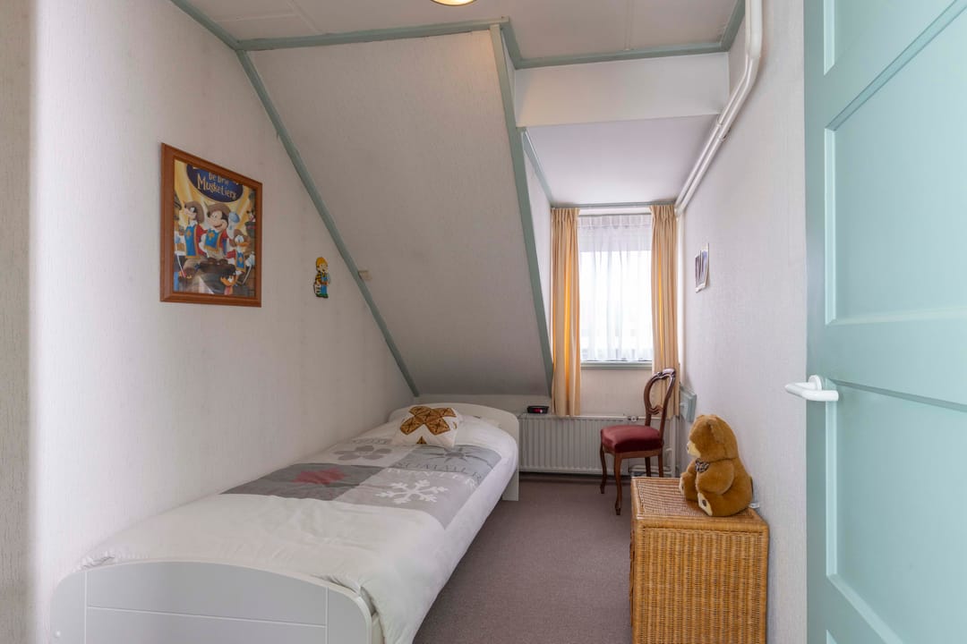 Overloop naar drie slaapkamers. Verder op de overloop een vaste kast. De kozijnen zijn voorzien van rolluiken. Op de slaapkamers en de overloop ligt vloerbedekking.