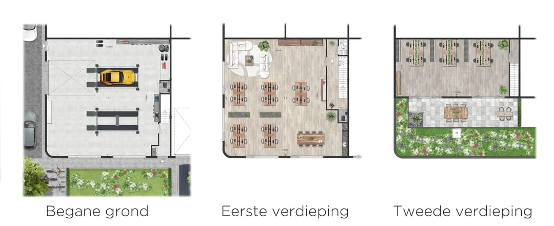 Alle units zijn voorzien van een dakterras op de 2e verdieping en twee eigen voor verschillende sectoren. Daarnaast biedt het terrein ruimte voor groei, met parkeerplaatsen.