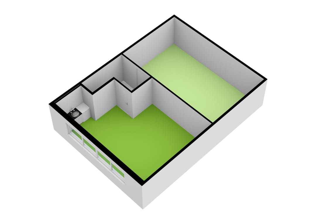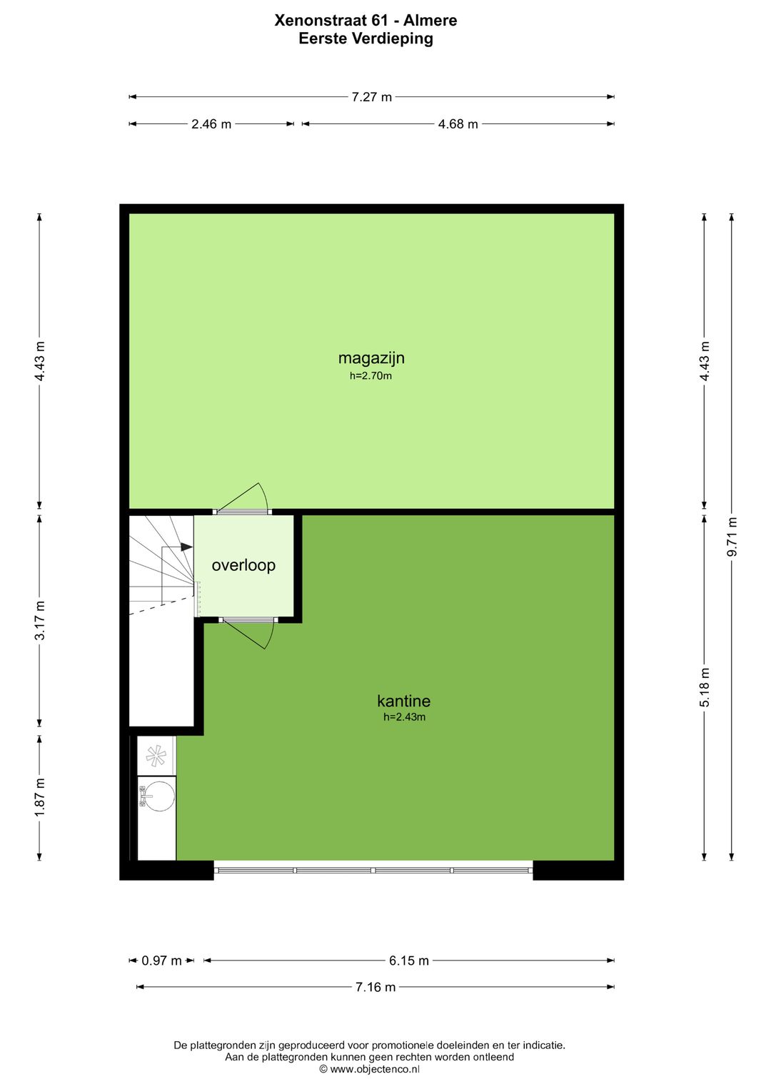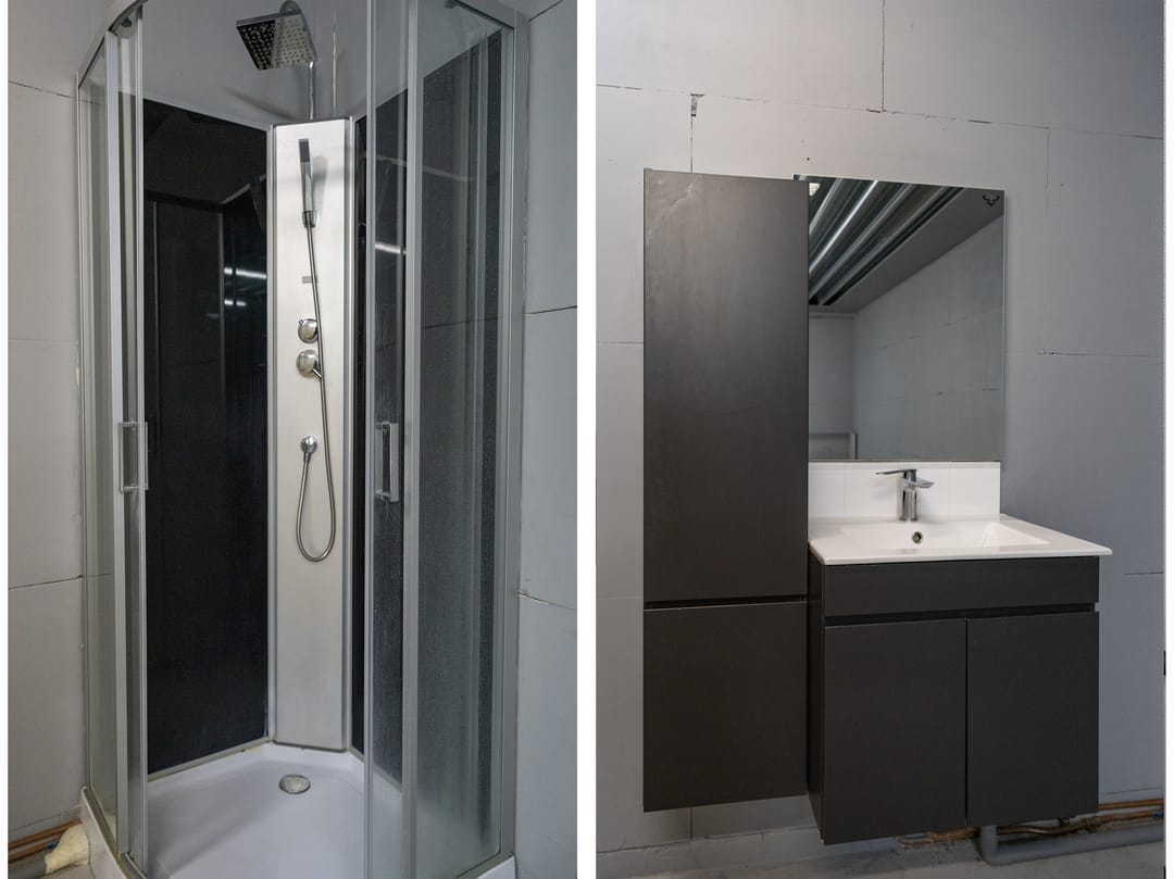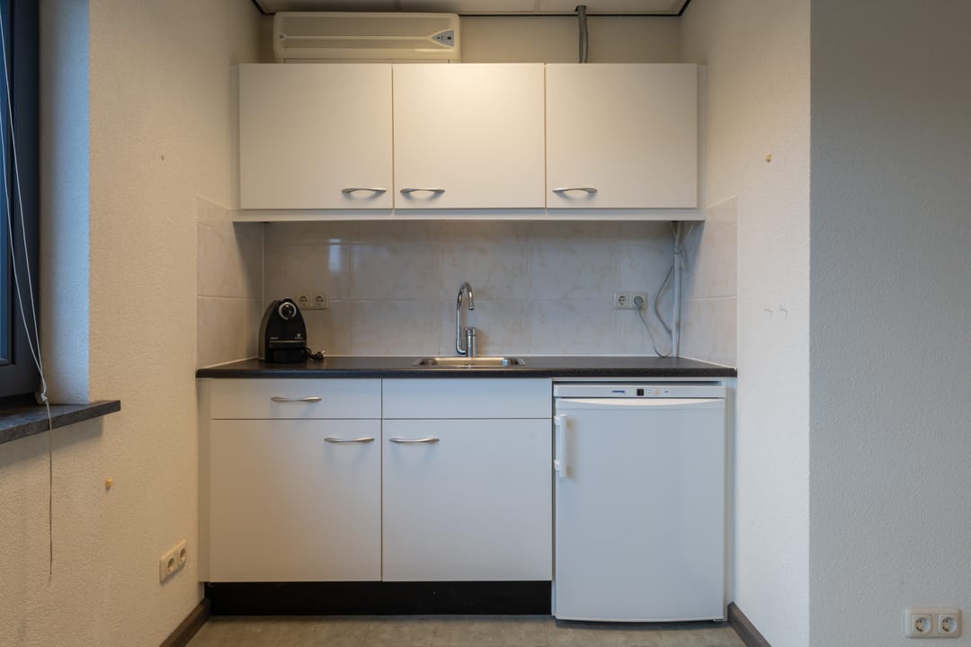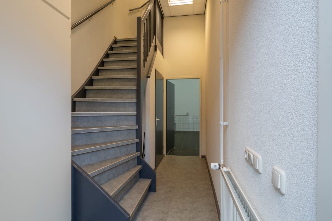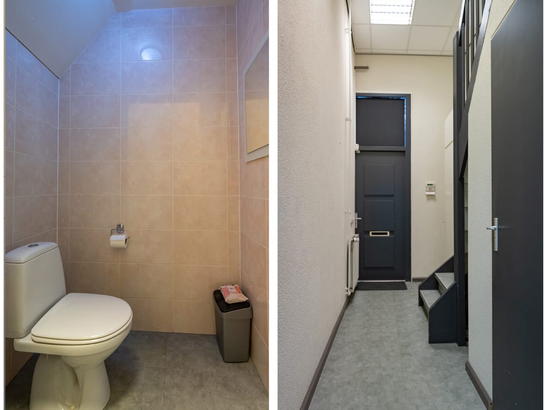 Op de verdieping is een complete kantoorruimte met een pantry. Deze ruimte is ook v.v. airco. Naast deze ruimte is een tweede ruimte v.v. een douche en wastafel.