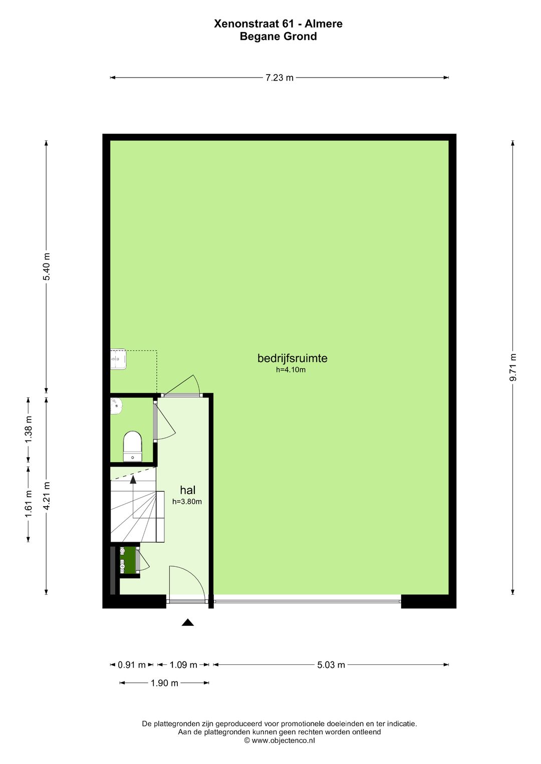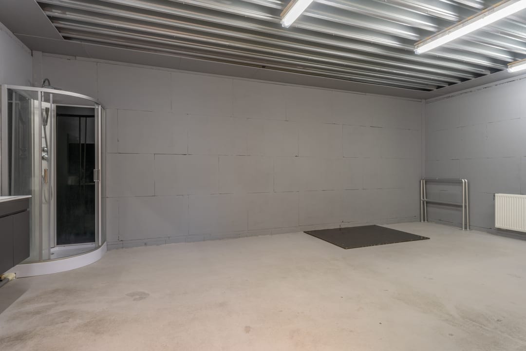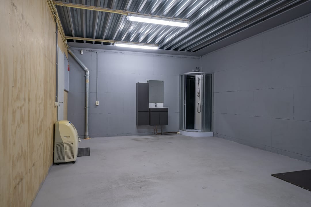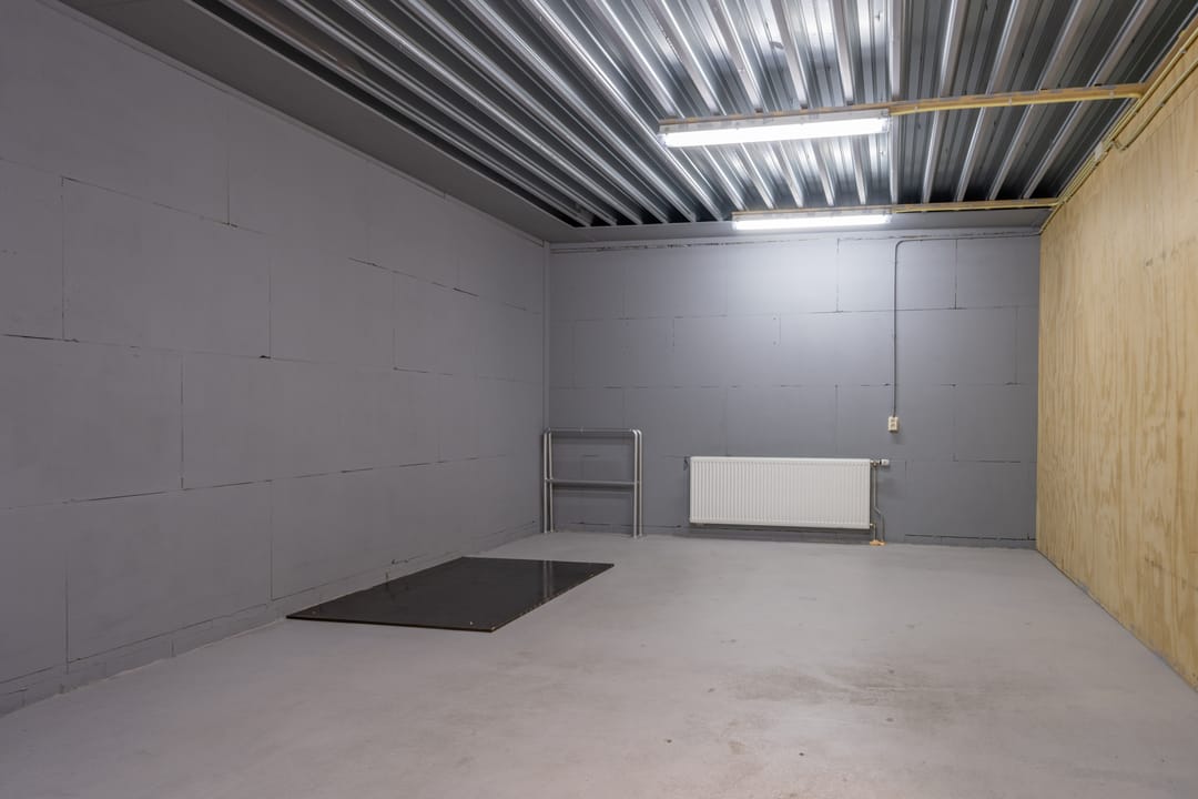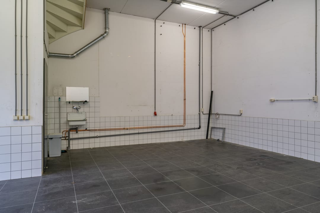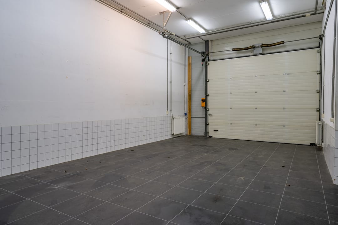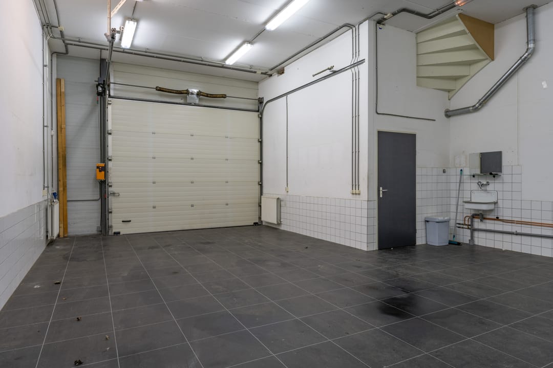 Entree, hal, meterkast, toilet en toegang naar de bedrijfsruimte. Bedrijfsruimte met elektrische overheaddeur, vloeistofdichte vloer en krachtstroom.