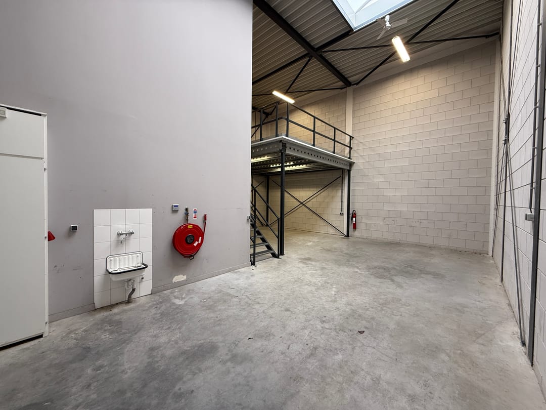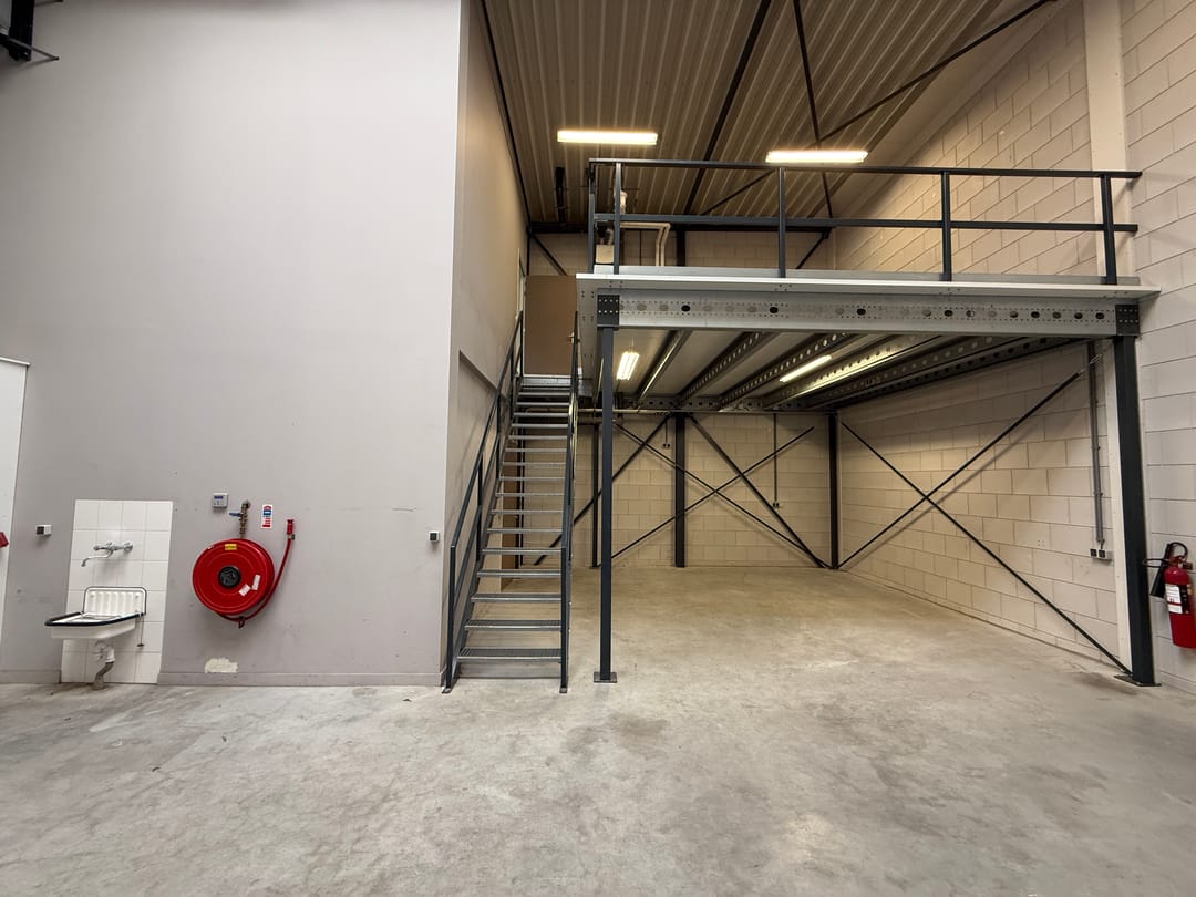 - solide entresolvloer, maximale vloerbelasting 500 kg/m², voorzien van stalen trapopgang, verlichting en hekwerk;