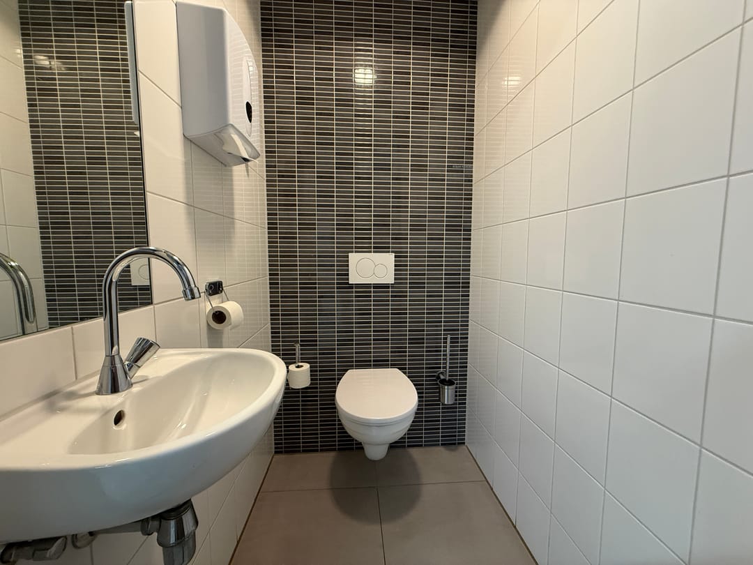 - luxe betegelde toiletruimte met wandcloset en fonteintje.