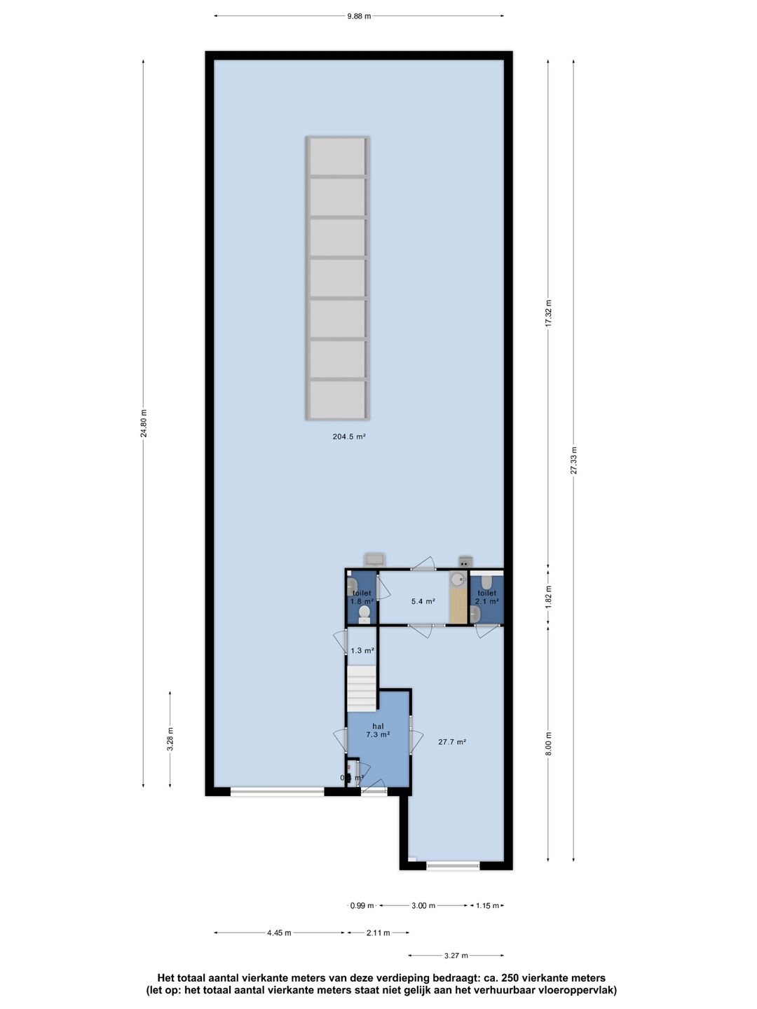 De oppervlakten zijn zo zorgvuldig mogelijk vastgesteld, doch mogen niet worden aangemerkt als zuivere verhuurbare oppervlakte volgens de Nederlandse Eenheids Norm NEN 2580.