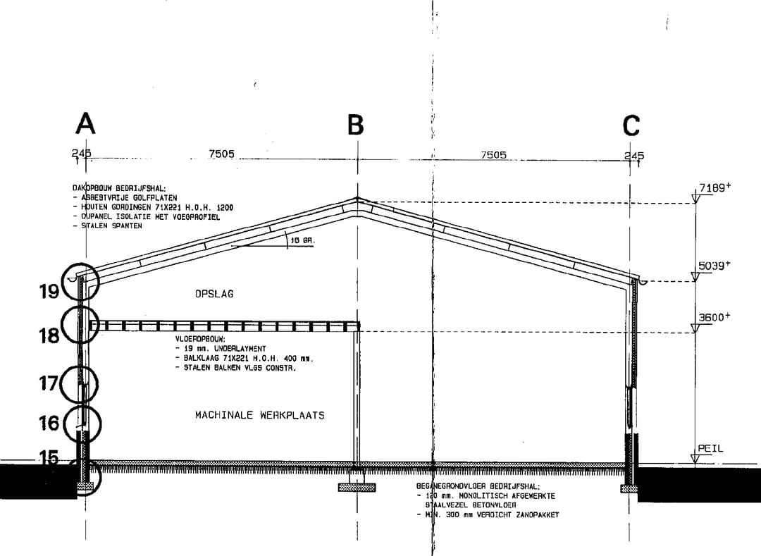 De bedrijfshal is opgetrokken in staalskelet constructie, zadeldak met asbestvrije golfplaten gedekt. Voorgevel opgetrokken in spouw metselwerk, overige gevels opgetrokken in metselwerk borstwering met daarboven gevelbeplating. Volledig geïsoleerd. Hardhouten kozijnen met isolerende beglazing.