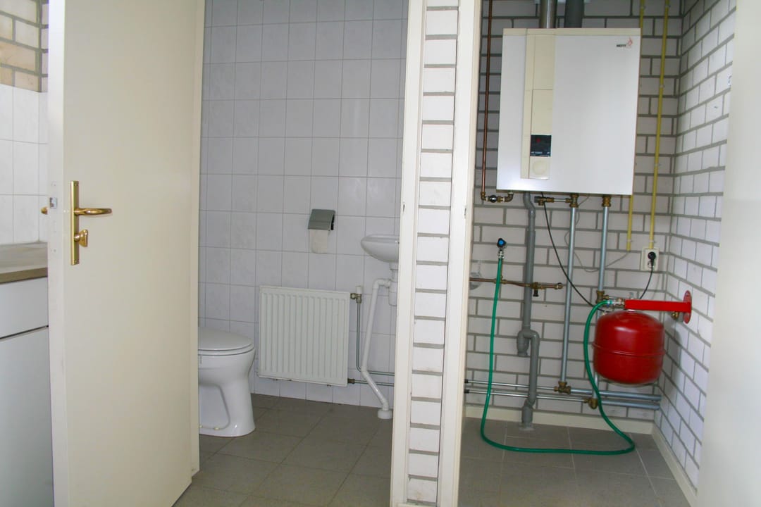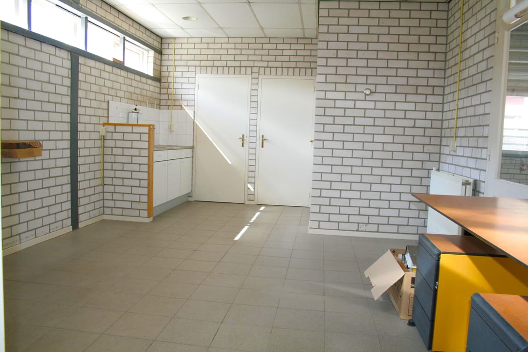 Bedrijfsruimte met meterkast, heater en een elektrische overheaddeur. Kantoor met toilet, berging en werkkast met opstelling Nefit HR cv-ketel.