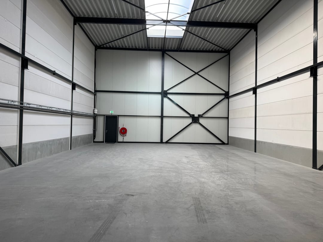 - Lichtstraten, overheaddeuren, krachtstroom, betonvloer, toilet, pantry, inbouwarmaturen en te openen ramen