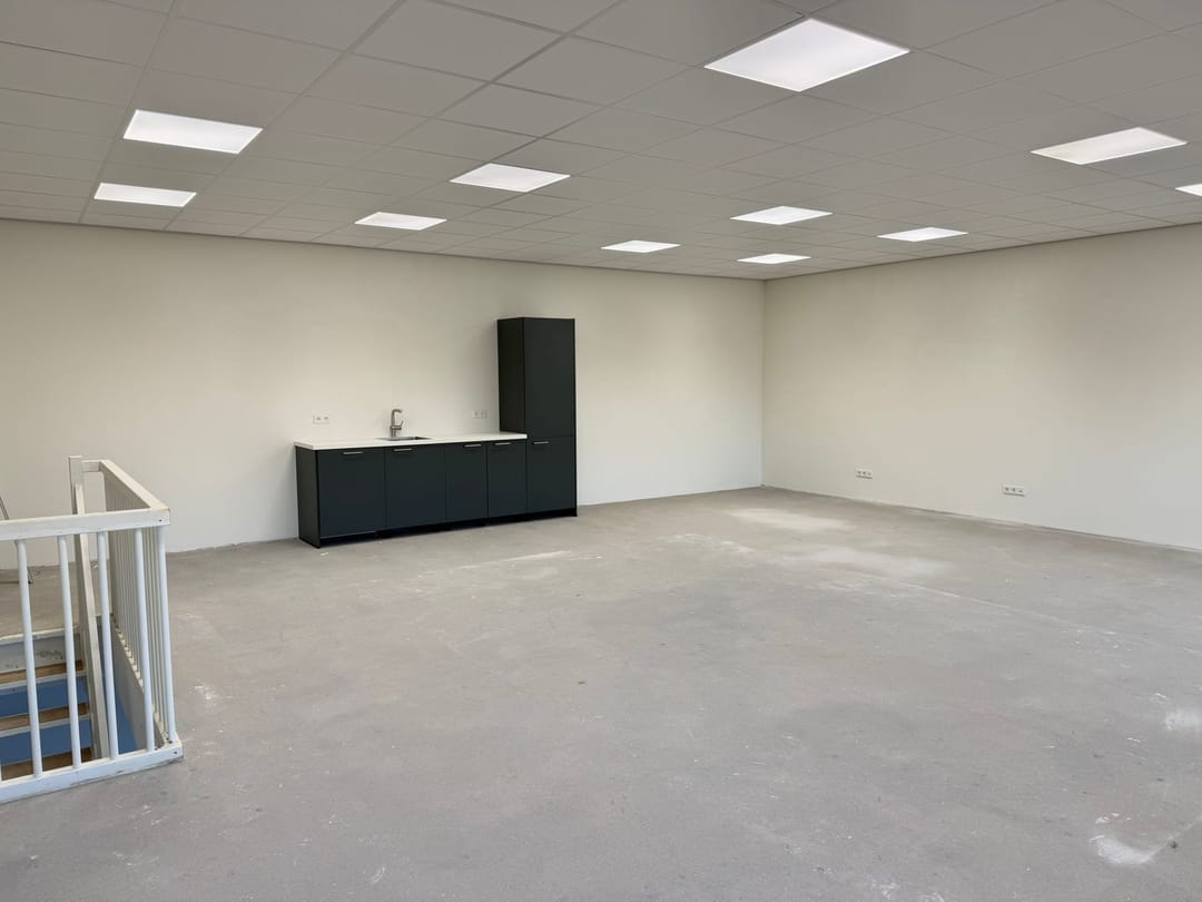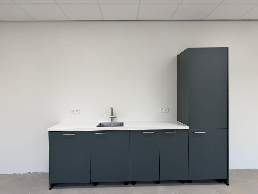 Kantoorruimte met keuken, systeemplafond met Led inbouwverlichting en 2 airco units.