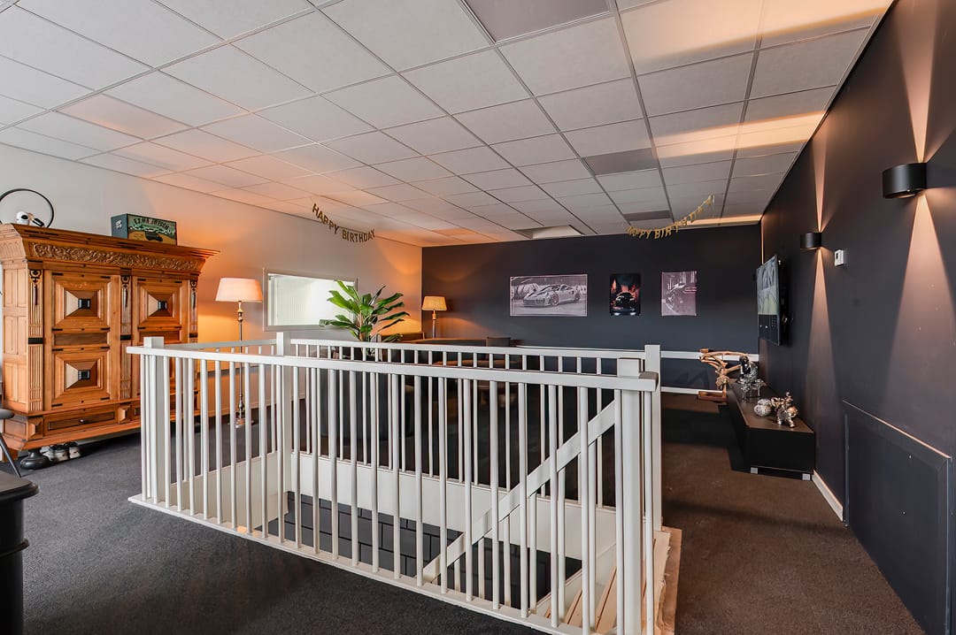 * Separate houten verdiepingsvloer bereikbaar vanuit de bedrijfsruimte, geschikt als extra magazijn.