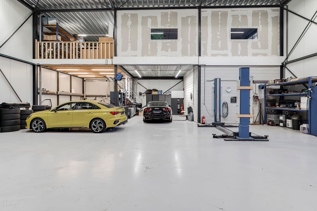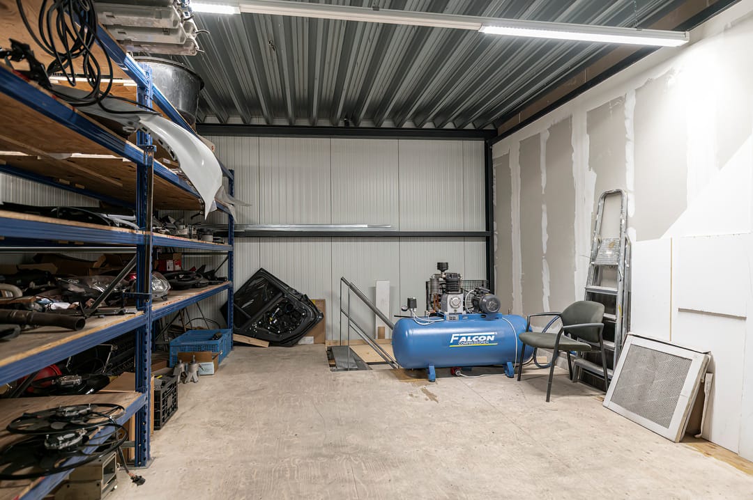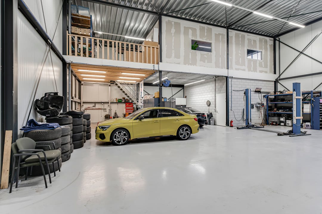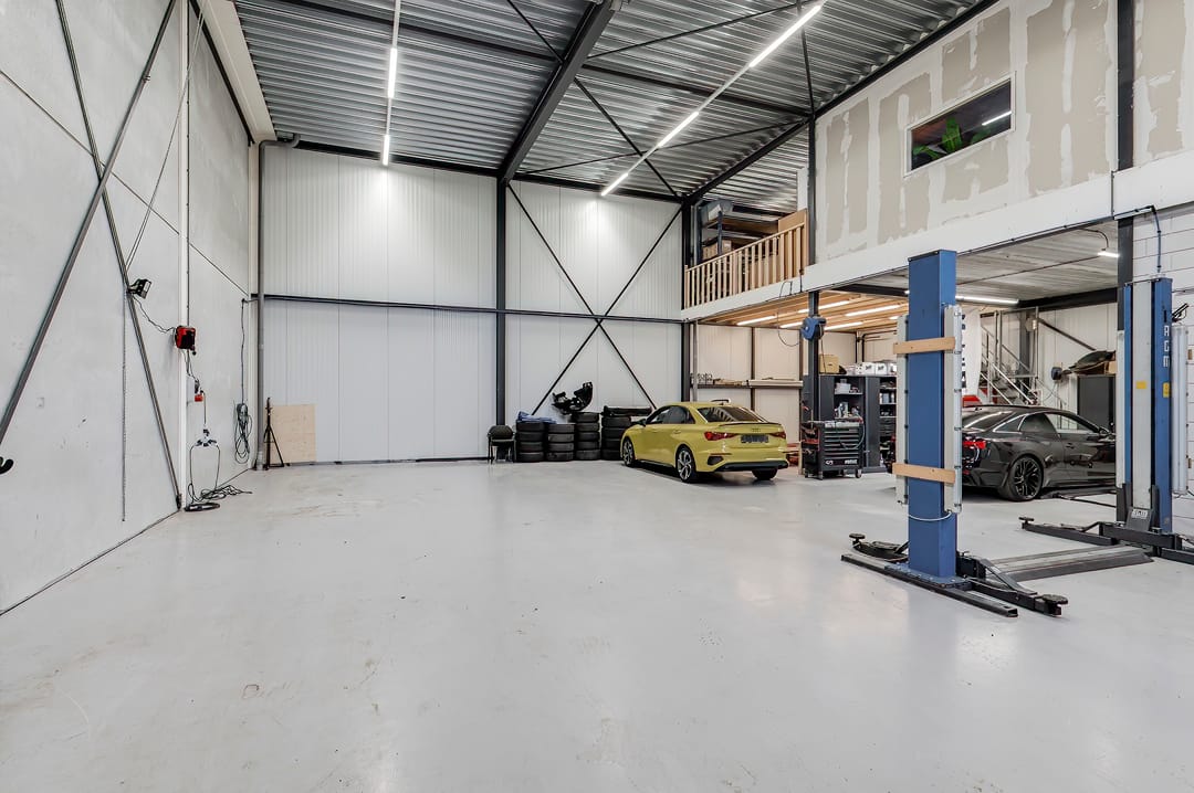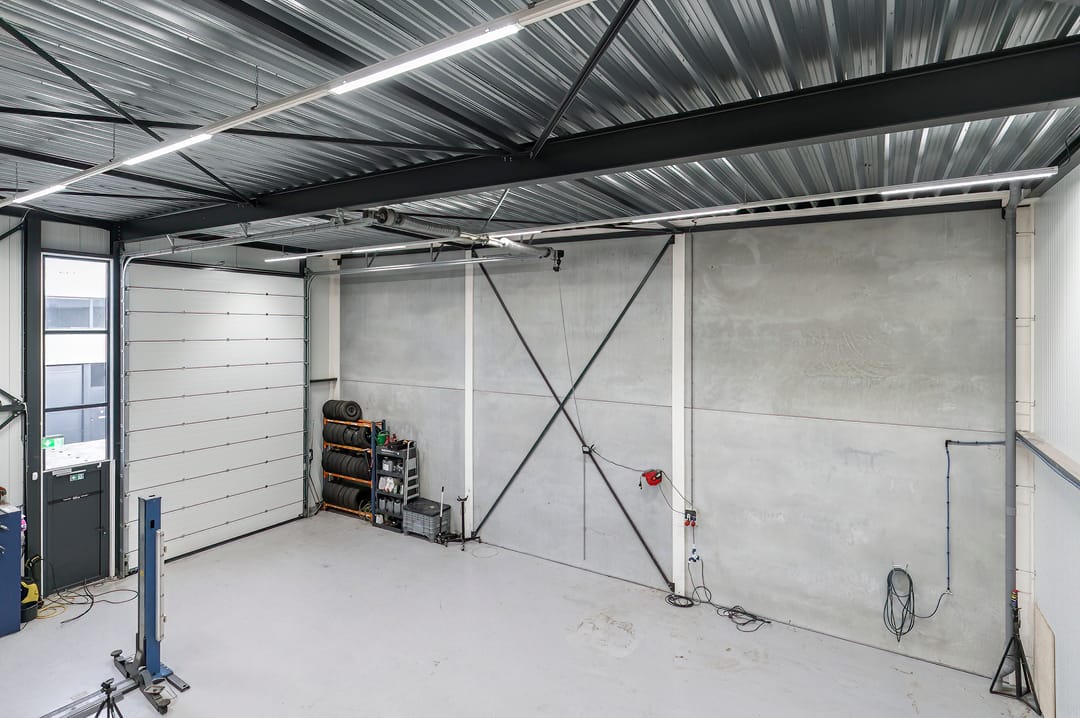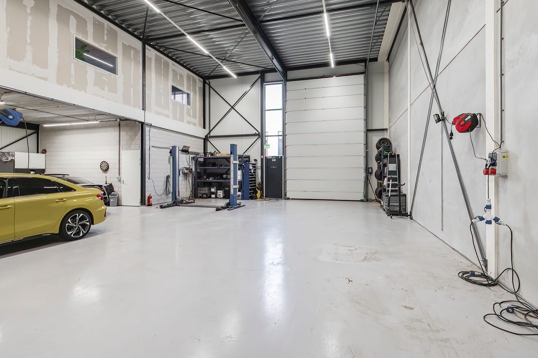 - Overheaddeuren, krachtstroom, betonvloer, toilet, pantry, inbouwarmaturen en te openen ramen