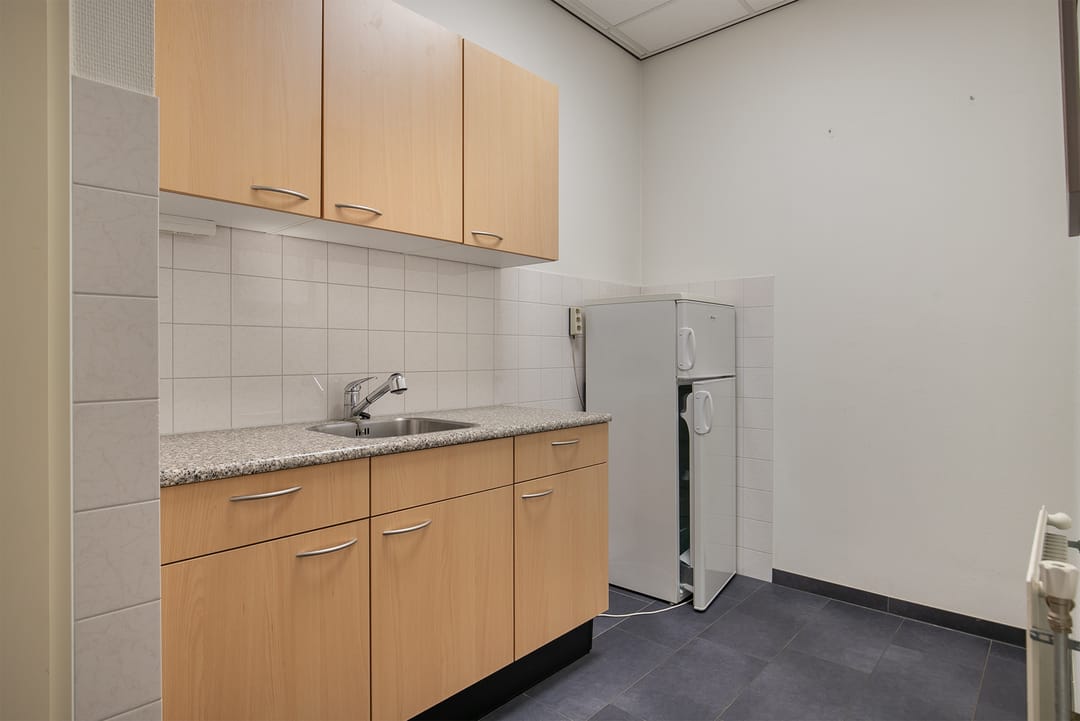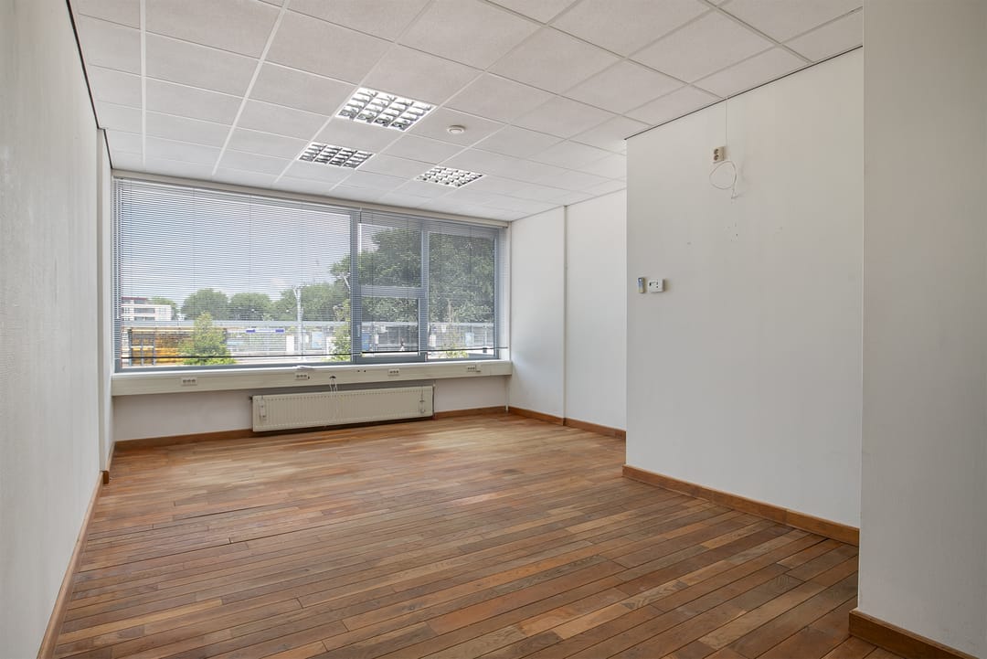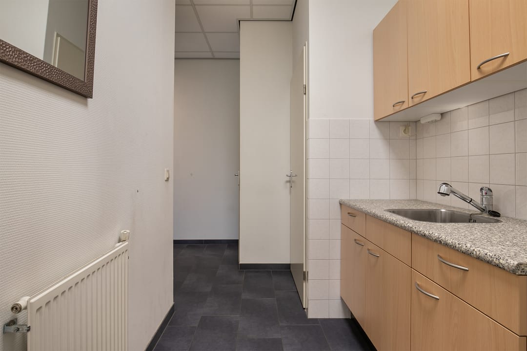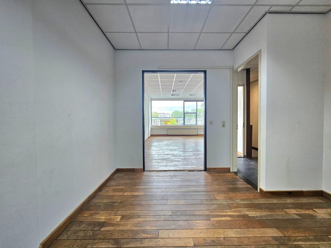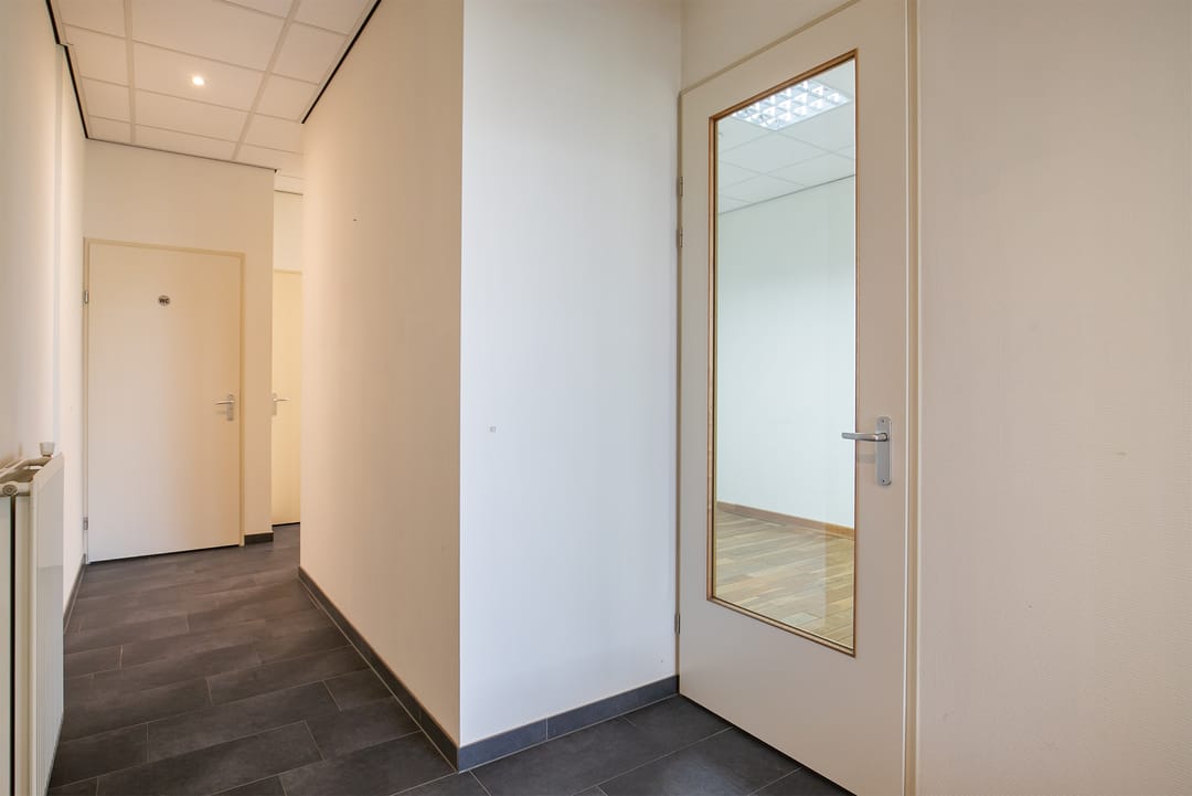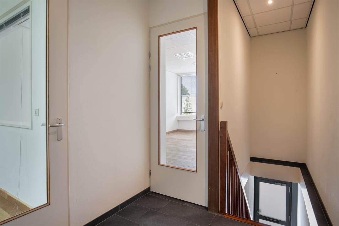Via de hal bij de entree bereikt u middels een vaste houten trap de eerste verdieping. Hier bevindt zich een nette, instapklare kantoorruimte. Deze ruimte kan desgewenst worden ingedeeld in bijvoorbeeld een separate spreekkamer en kantoorruimte. Aan de achterzijde zijn een toilet en pantry aanwezig.