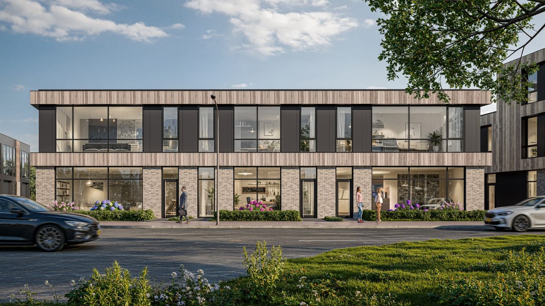 - De buitengevels worden uitgevoerd met beplating en houten kaders volgens tekening en detaillering architect;