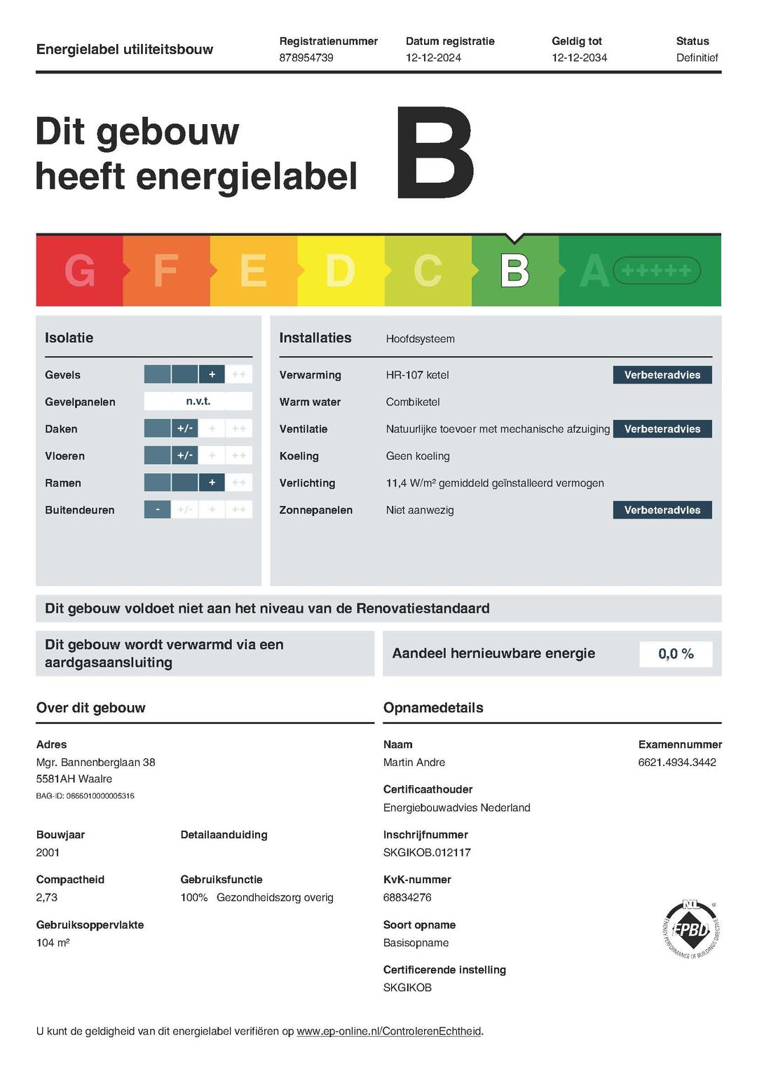 De ruimte beschikt over het zeer gunstige energielabel B welke geldig is tot 12-12-2034.