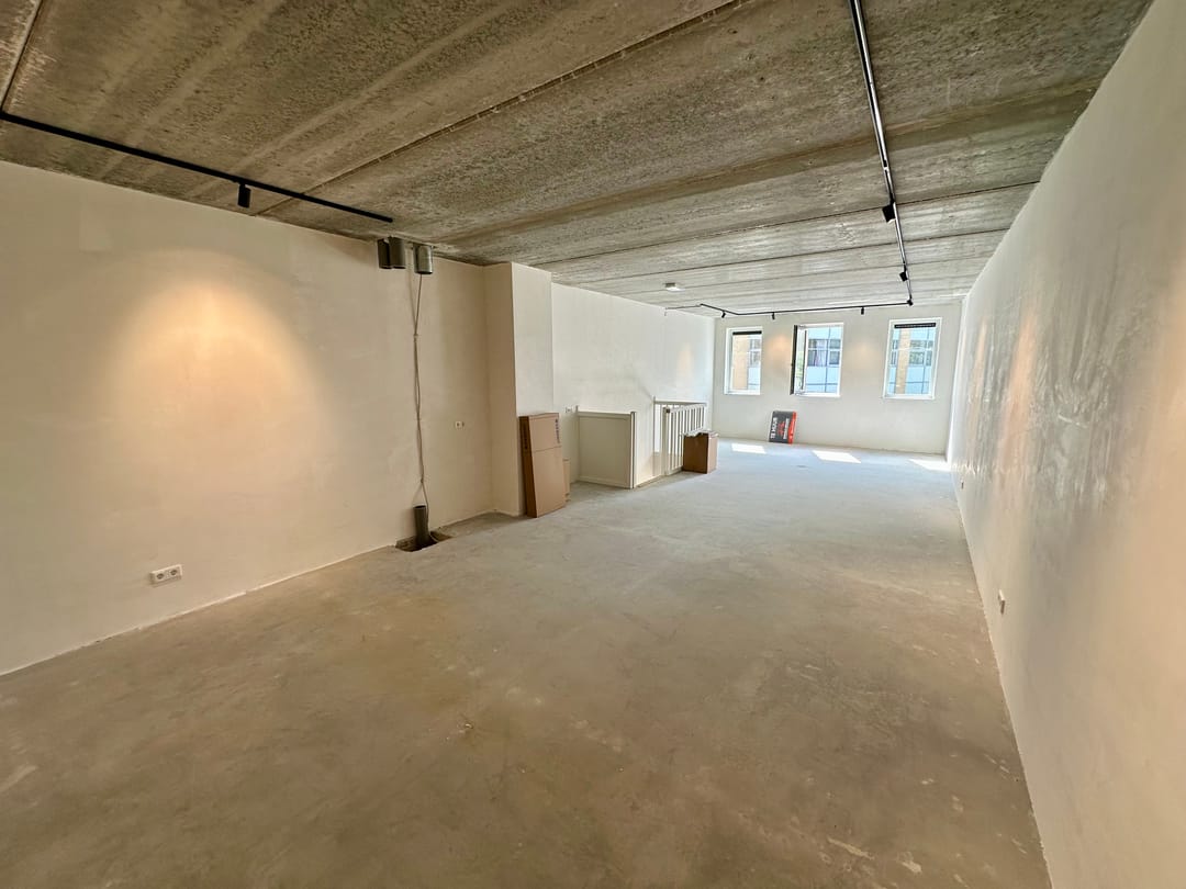 De ruimte op de eerste verdieping is voorzien van dimbare verlichting op rails met 10 spots. Deze zijn flexibel te verplaatsen en eventueel uit te breiden met hangverlichting. Daarnaast zijn er ruim voldoende dubbele wandcontactdozen aangebracht, wat de unit bijzonder praktisch maakt voor kantoorfuncties.