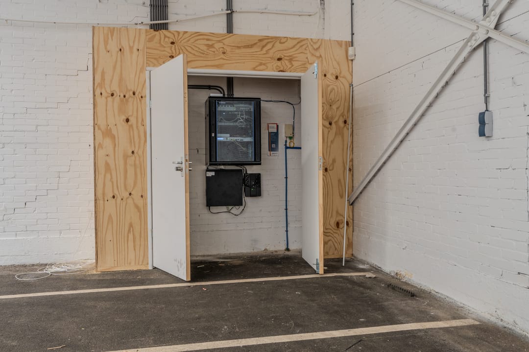 Kantoorruimte: bij in-/uitgang, in 2021 voorzien van nieuwe geïsoleerde wandpanelen.