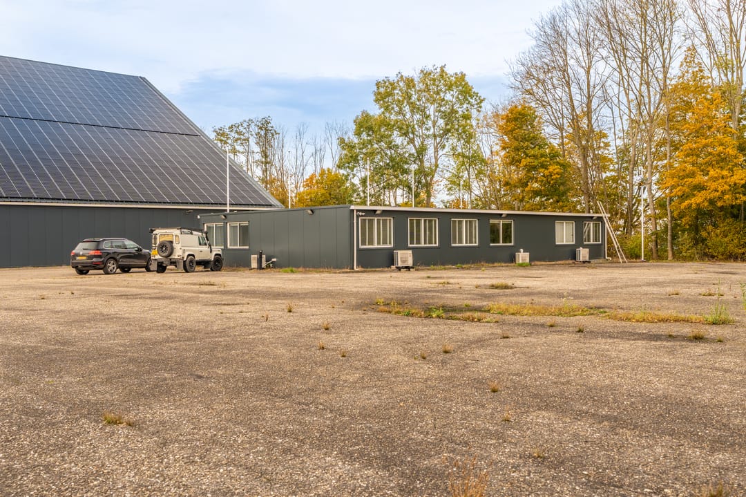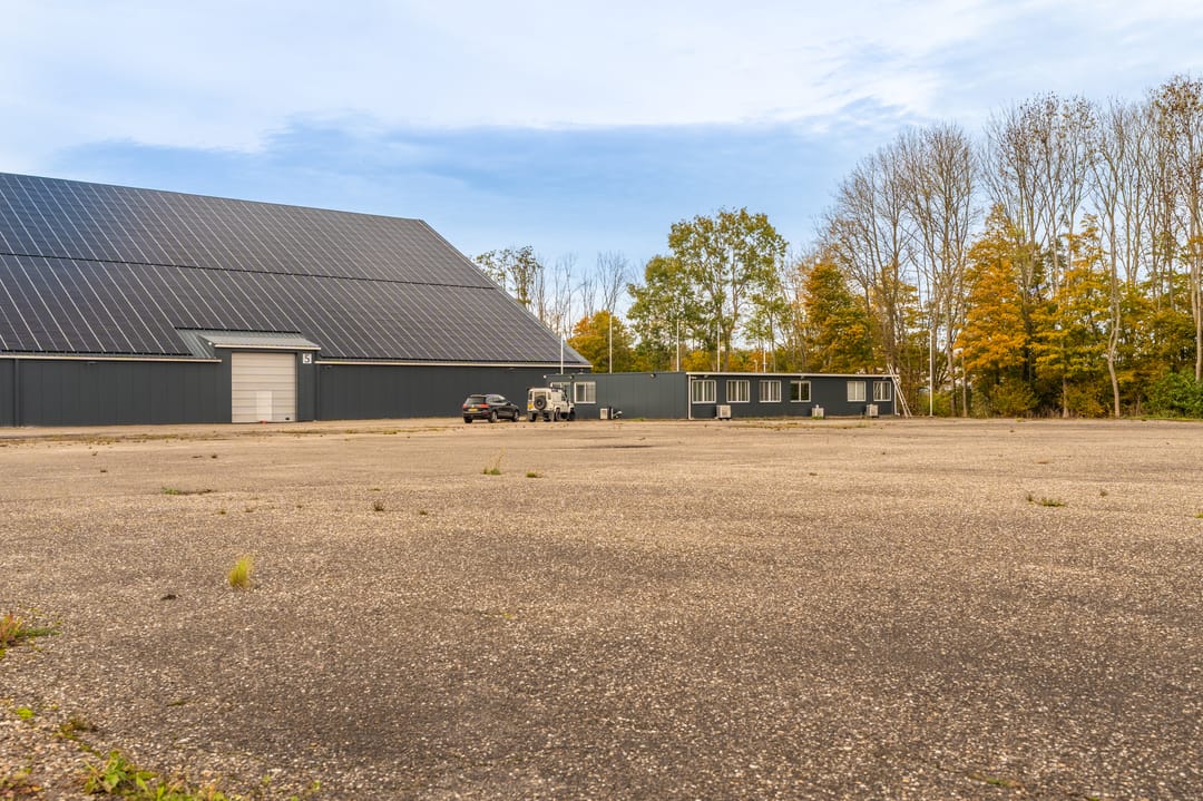 Het geheel is gesitueerd op een ruim perceel met zowel verhard als onverhard buitenterrein, geschikt voor opslag, parkeren en manoeuvreren van voertuigen.