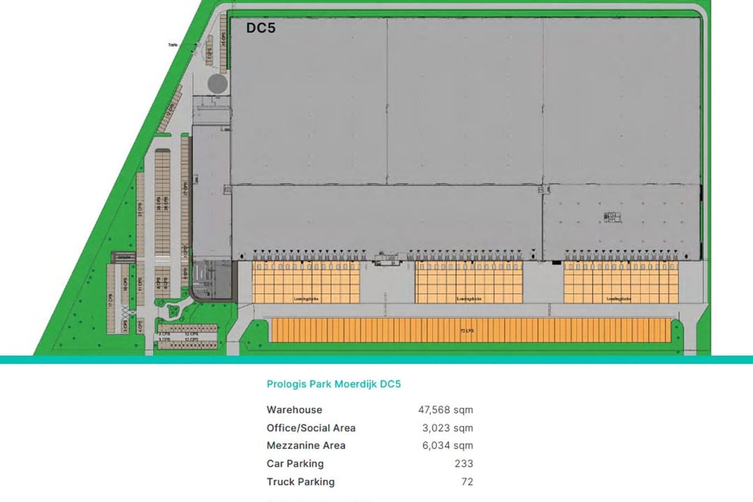 Prologis Park Moerdijk is strategisch gelegen aan de Tradeboulevard in Moerdijk en maakt onderdeel uit van het industriegebied Moerdijk. Dit betreffende warehouse DC 5 heeft een oppervlakte van circa 56.625 m² en kan zowel in zijn geheel als in delen worden gehuurd.