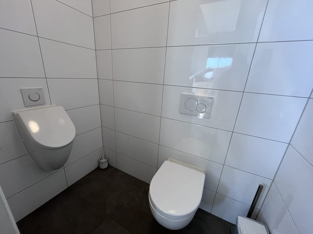 - toiletruimte met hangend toilet en urinoir op de begane grond, aparte wasbak in de hal