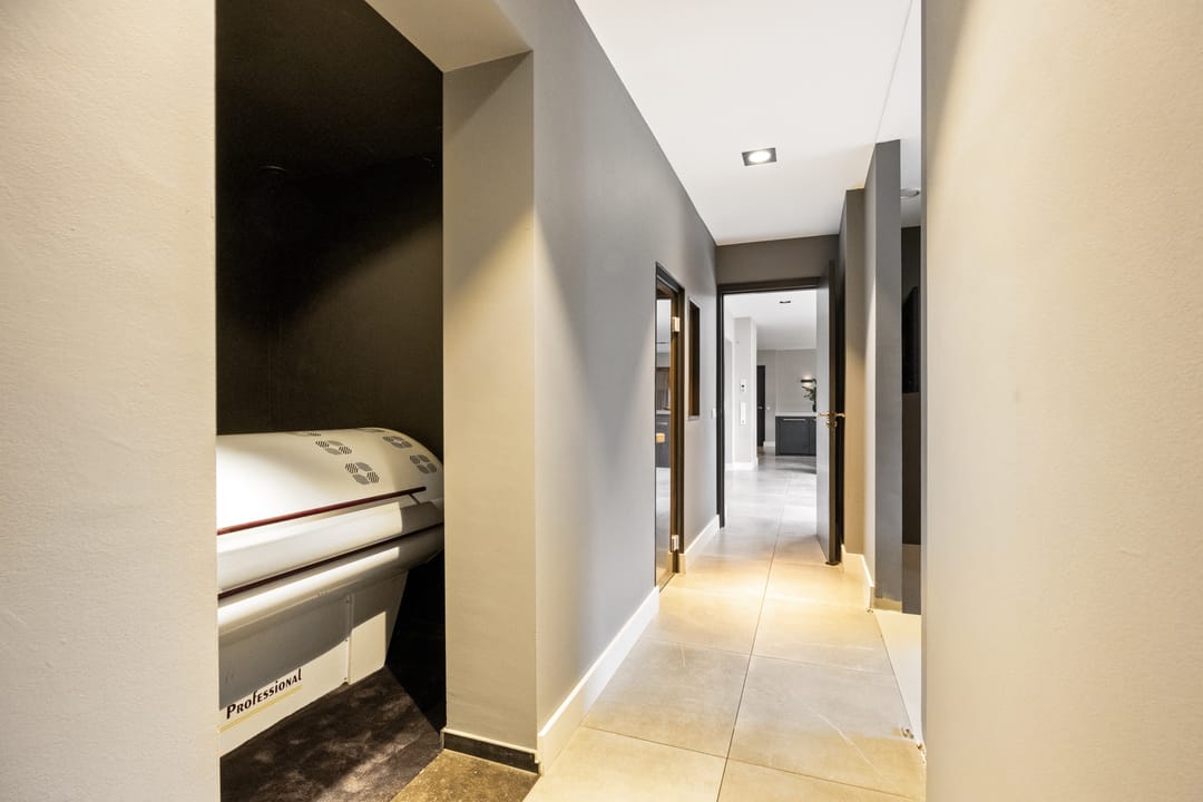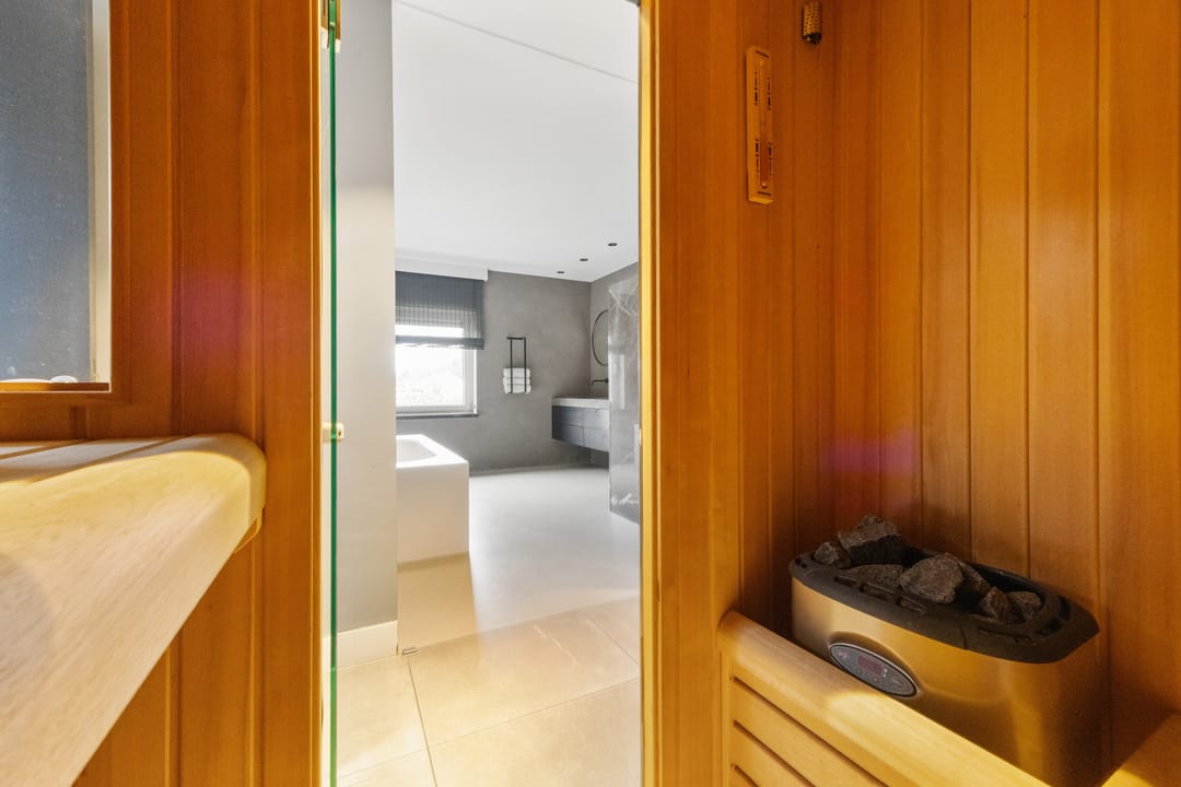 - overloop met glazen dak, balkon, toilet met vaste wastafel, urinoir en closet (zeer luxe), lift, leefkeuken met fraaie keukeninrichting met apparatuur en bergruimte, living met prachtige kasten op maat gemaakt, gang, badkamer met closet, ligbad, wastafelmeubel en inloopdouche (luxe), sauna, bergruimte, vier slaapkamers en riant terras;