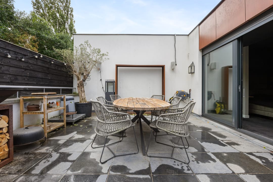 - op de tweede verdieping met vaste trap bereikbare overloop, twee slaapkamers en een dakterras, badkamer met douche, wastafelmeubel en closet.