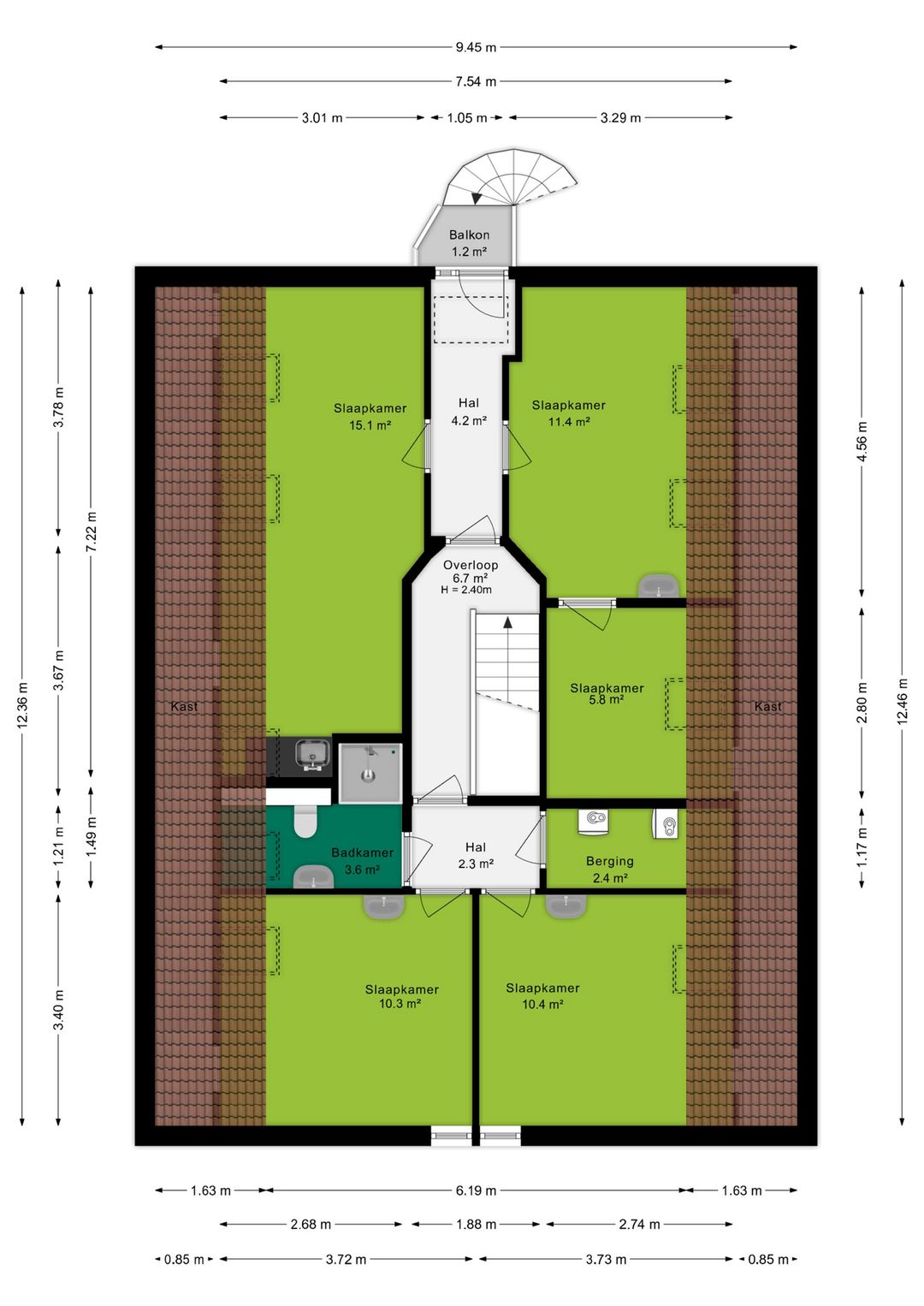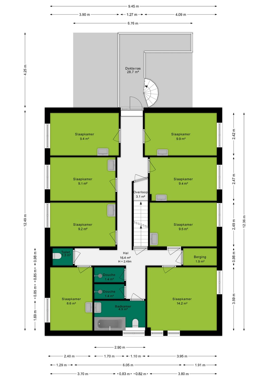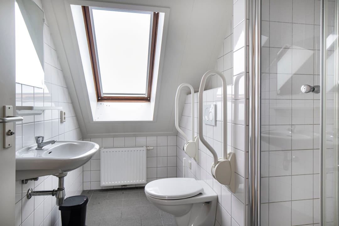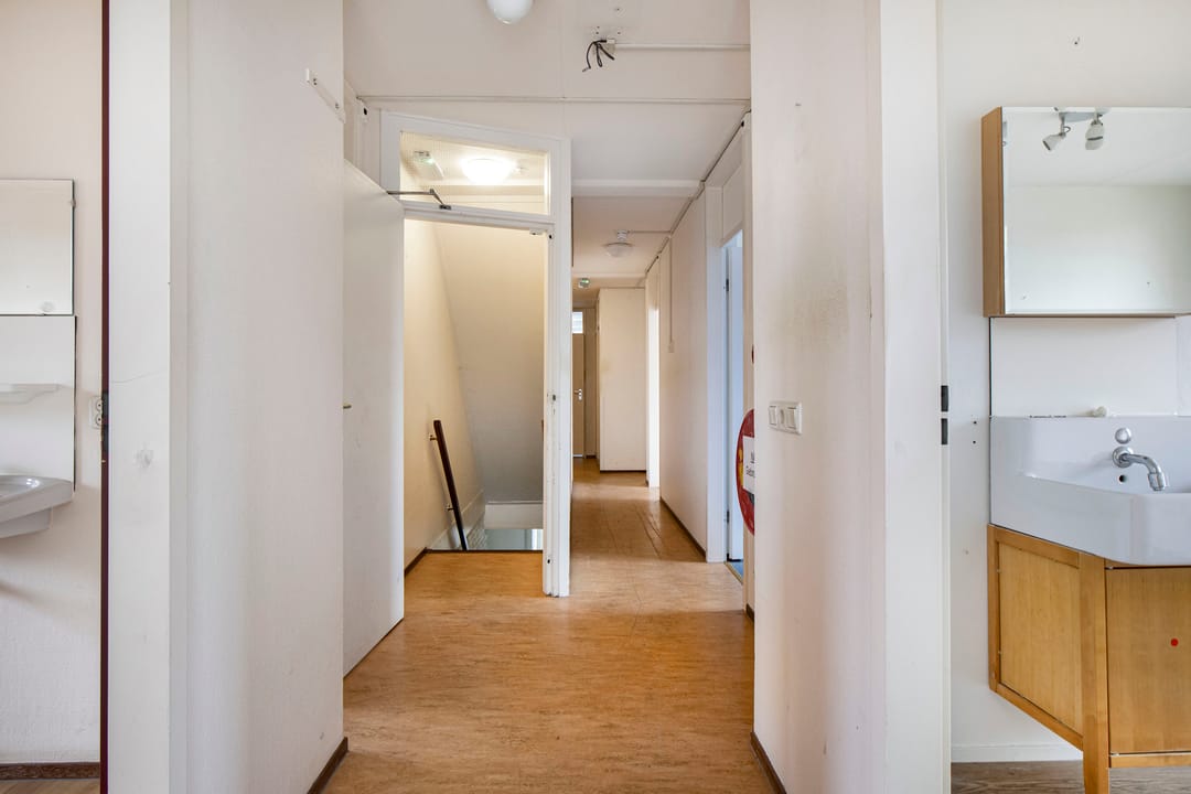 Op de eerste verdieping is een ruime hal aanwezig van waaruit alle kamers toegankelijk zijn. Zo vindt je op de eerste verdieping 8 slaapkamers. 1 badkamer, 2 afzonderlijke douches en 1 afzonderlijk toilet. Aan het einde van de hal is een toegangsdeur naar het platte dak, hier vind je ook de brandtrap/nooduitgang.