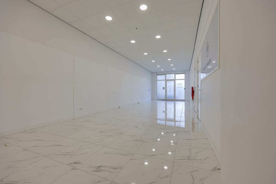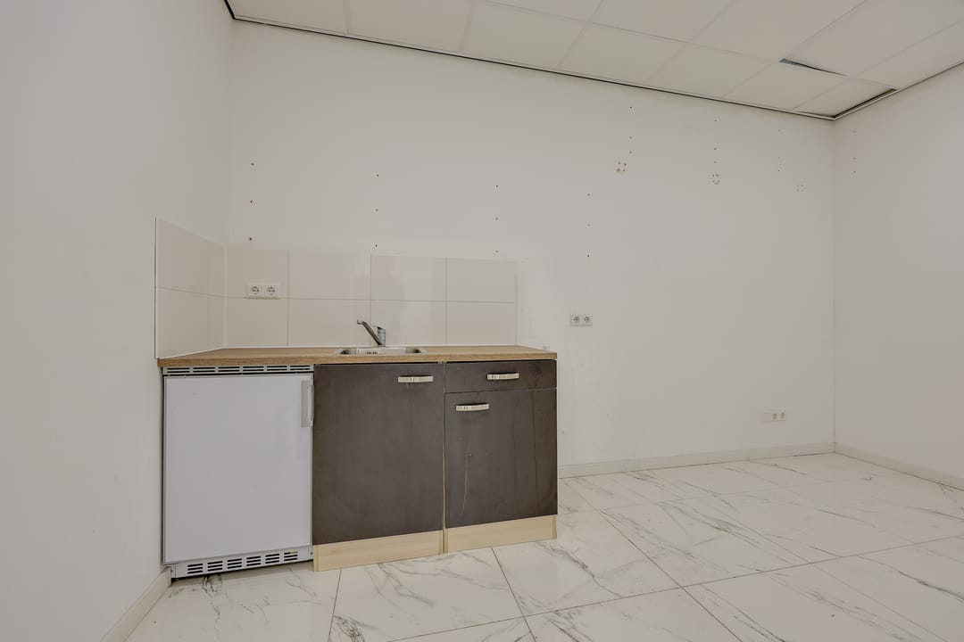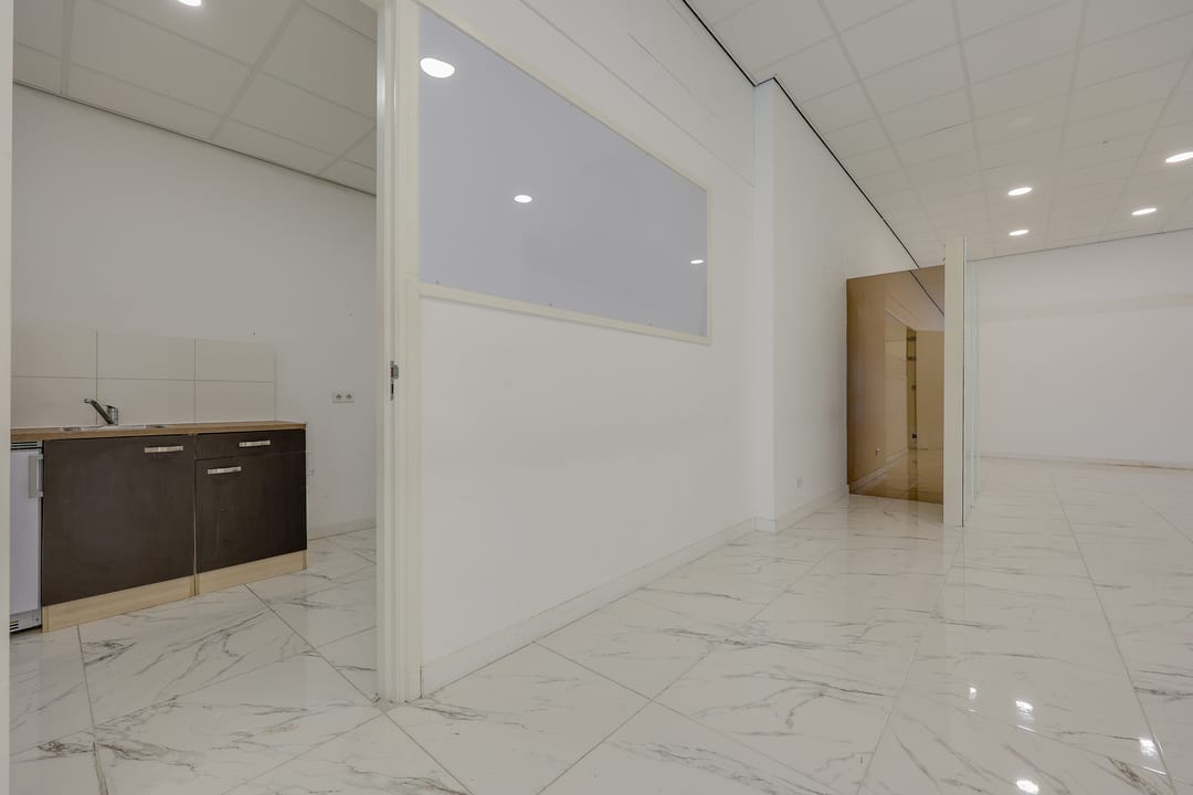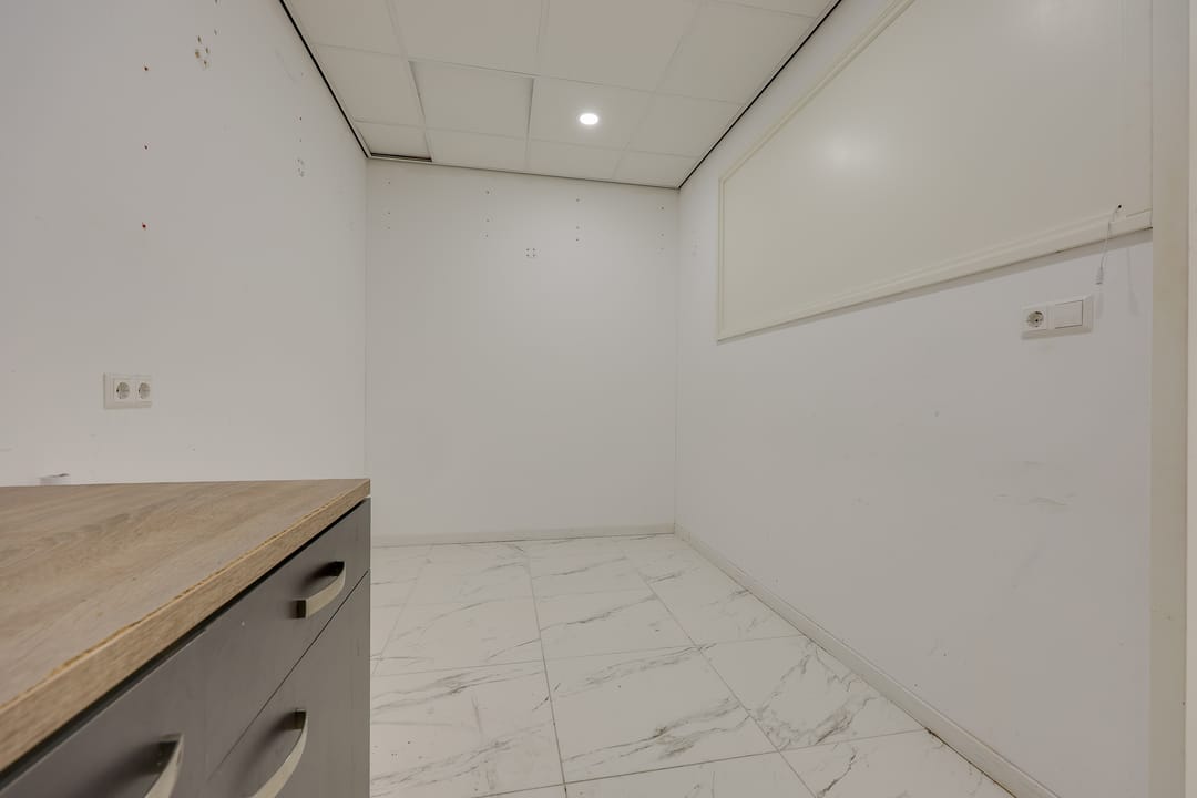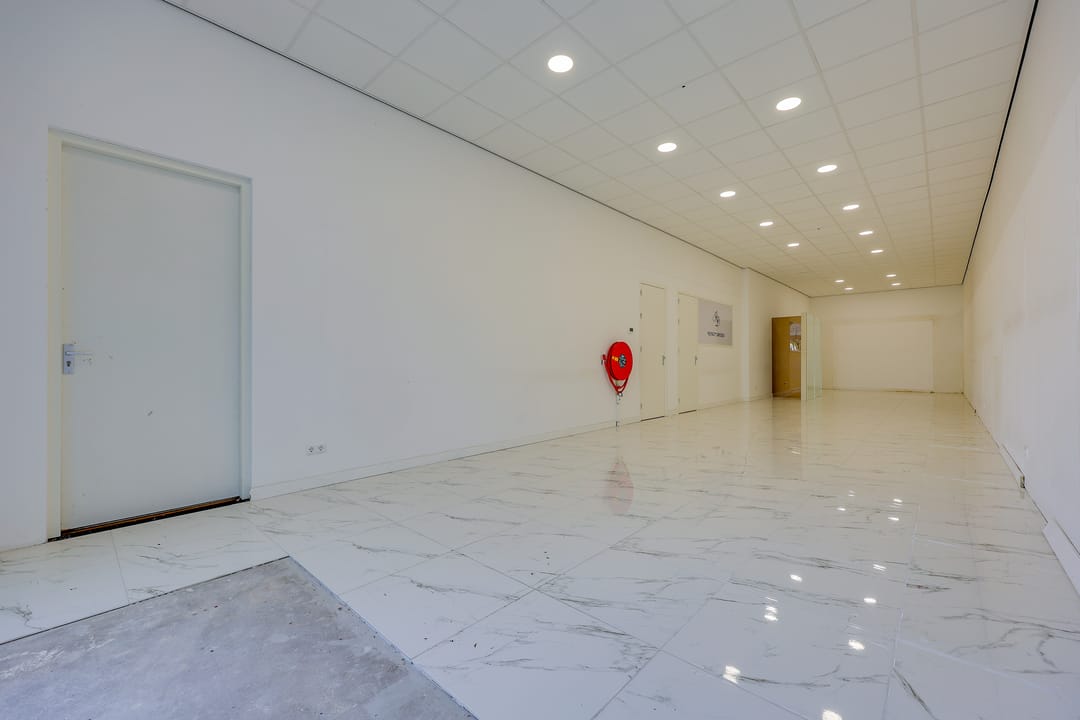 De bedrijfsruimte is voorzien van een plavuizenvloer met vloerverwarming, systeemplafond met verlichting, een brandslanghaspel en 2 eigen parkeerplaatsen voor de ingang.