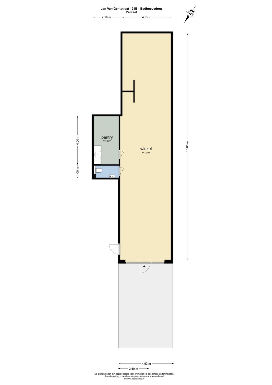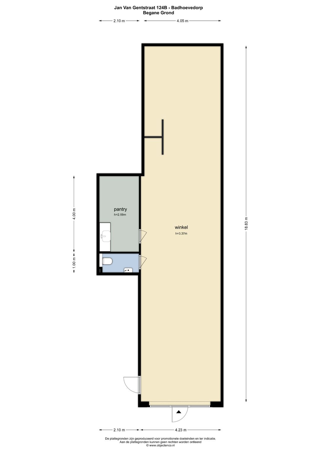Entree, bedrijfs-/winkelruimte van circa 19 meter diep en ruim 4 meter breed (circa 79 m²) met aparte ruimte van circa 11 m² met pantry en keukenblok met gootsteen en koelkast en een apart toilet met fontein.