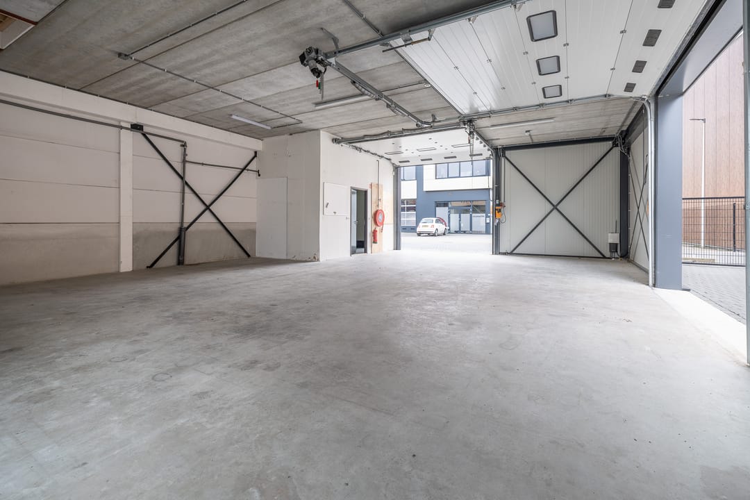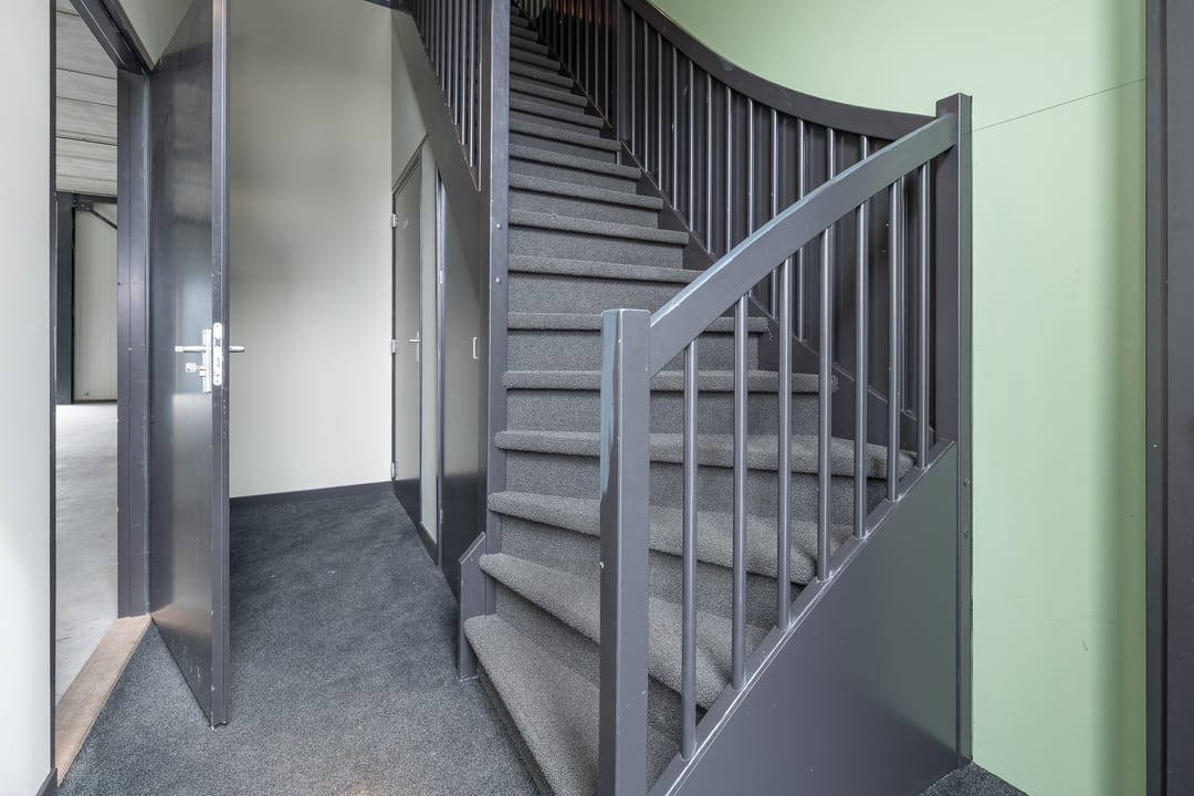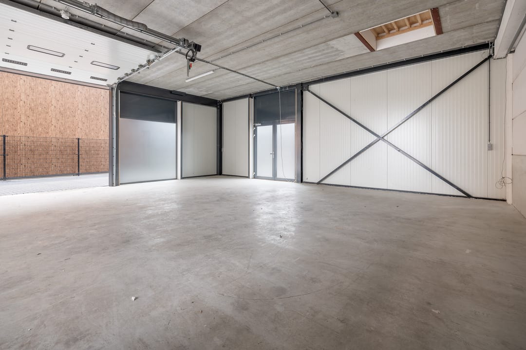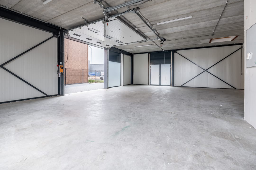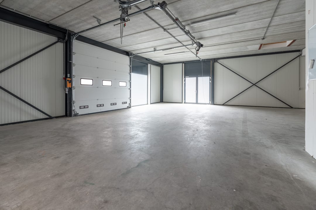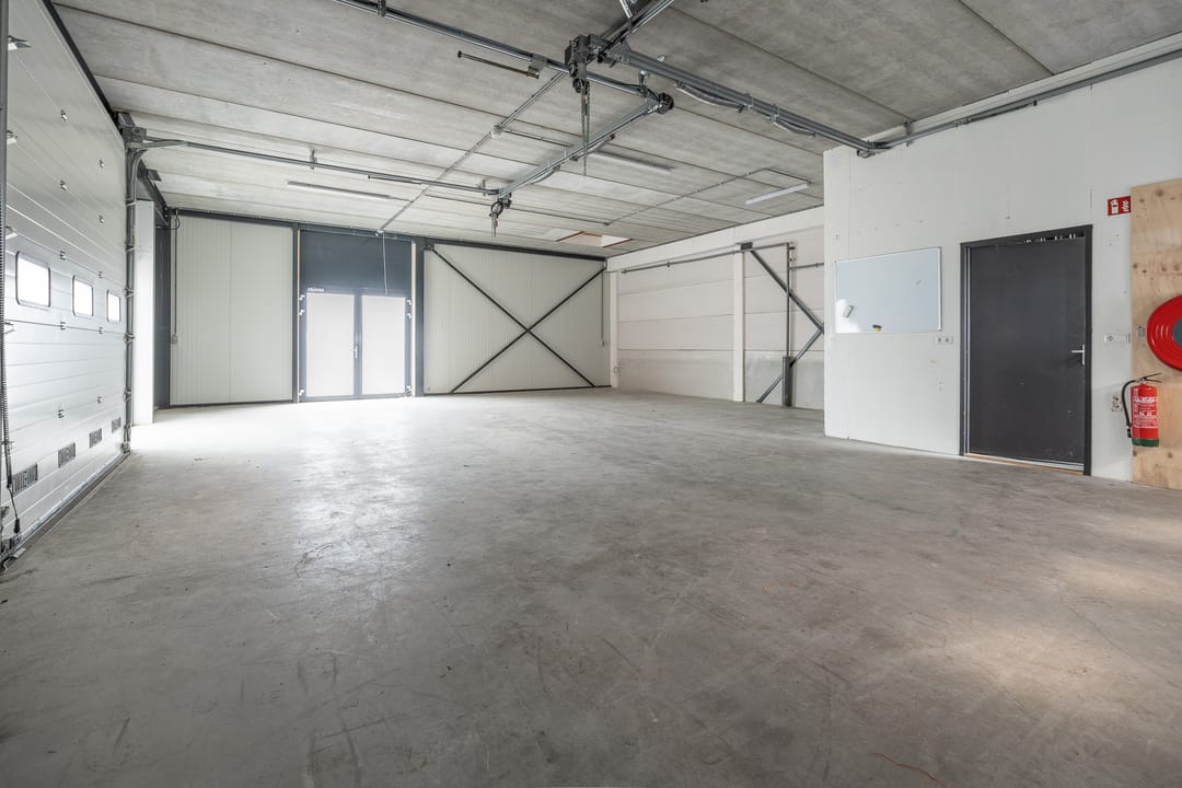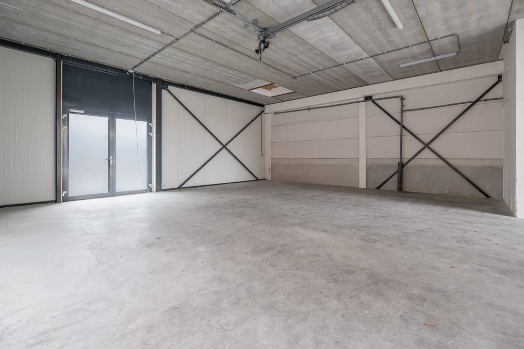 De begane grond bestaat uit een ruime, open bedrijfsruimte met aan de voorzijde een entree en een toilet. Via een overheaddeur aan de zijkant is het buitenterrein te bereiken, alsmede via de openslaande deuren aan de achterzijde. Via de entree bereik je de verdieping, waar de ruimte is opgedeeld in twee kantoren en een kantine met keukenopstelling.