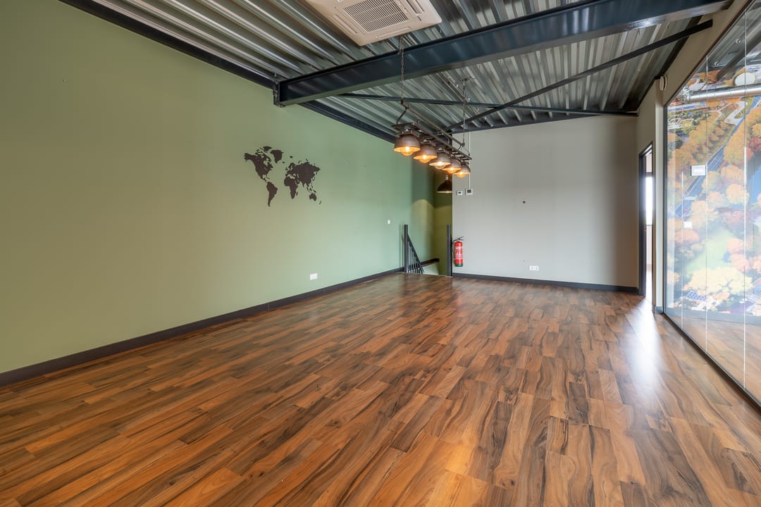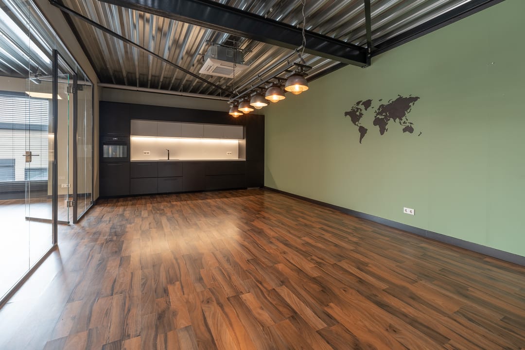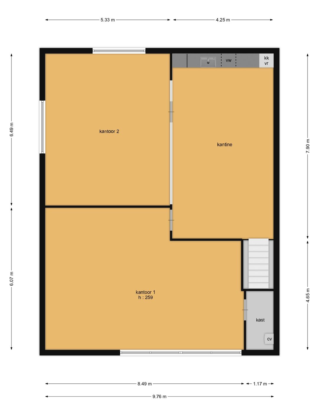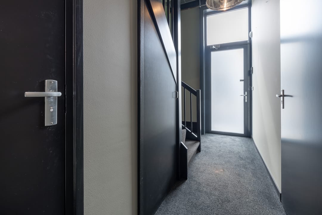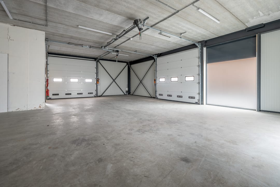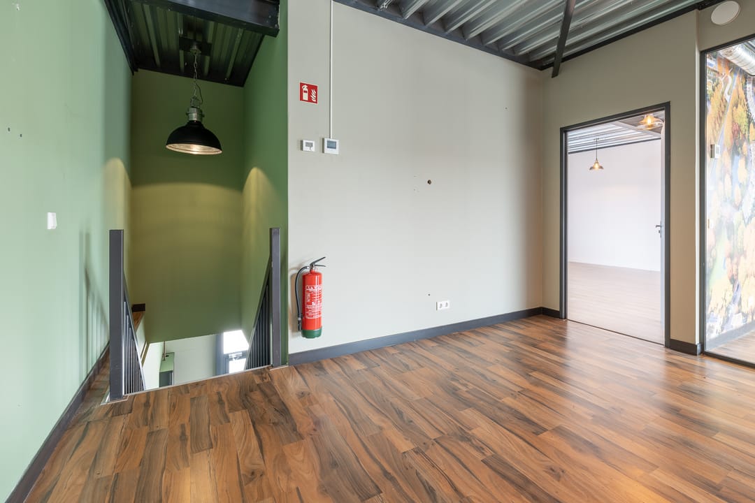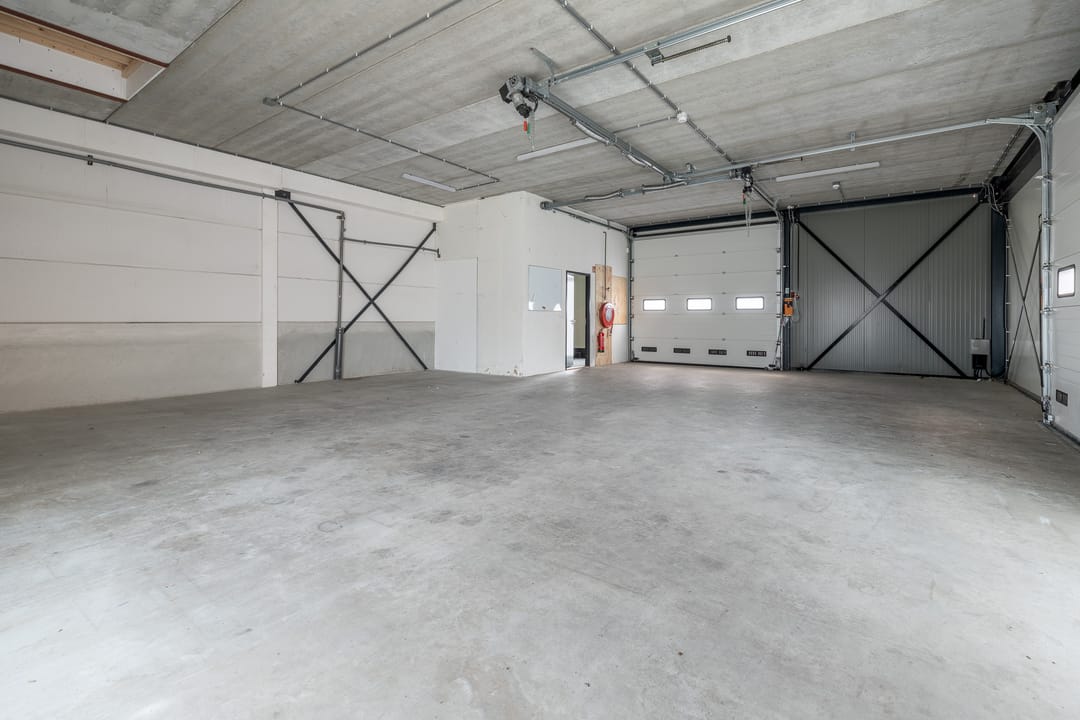 De begane grond bestaat uit een ruime, open bedrijfsruimte met aan de voorzijde een entree en een toilet. Via een overheaddeur aan de zijkant is het buitenterrein te bereiken, alsmede via de openslaande deuren aan de achterzijde. Via de entree bereik je de verdieping, waar de ruimte is opgedeeld in twee kantoren en een kantine met keukenopstelling.