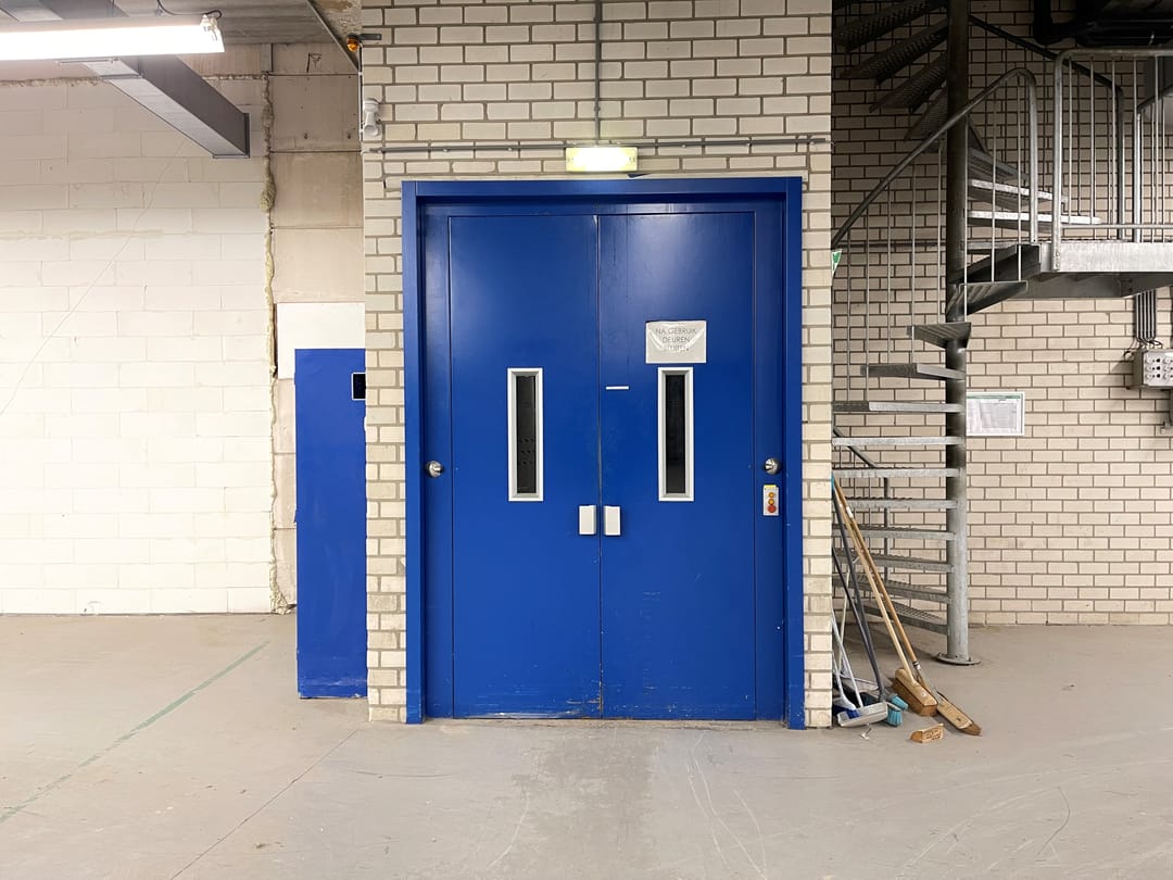 Begane grond: personeelsentree met trapopgang en betegelde was- en toiletgroep – bedrijfsruimte (met deels afgeschermde freesruimte) v.v. goederenlift en trap naar verdieping.