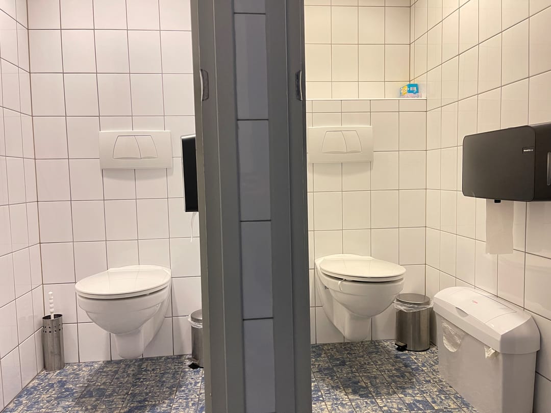 Verdieping: kantine met keukeninrichting – buitenterras – betegelde toiletgroep – bedrijfsruimte voorzien van wasbak – technische ruimte.