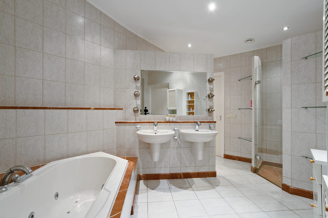 1e verdieping: hal met garderobe en halfhoog betegeld toilet met fonteintje – werkkamer – gang met vaste kastenwand en meterkast (11 groepen + krachtgroep) – 4 slaapkamers waarvan ouderslaapkamer met inloopgarderobe (thans zijn twee slaapkamers bij elkaar getrokken) – volledig betegelde wasruimte v.v. aansluiting was- en droogautomaat met opstelling “Nefit” HR combi ketel en opstelling afzuigunit centraal stofzuigersysteem – bijkeuken / bergkamer – luxe badkamer v.v. whirlpool ligbad, douchecabine, toilet en dubbele wastafel – woonkamer met speelhoek, half open kantoor, zithoek met open haard en serre – woon keuken met luxe inbouwkeuken v.v. granieten blad, inductiekookplaat, afzuigkap, vaatwasser, magnetron, oven en koelkast – achterportaal.