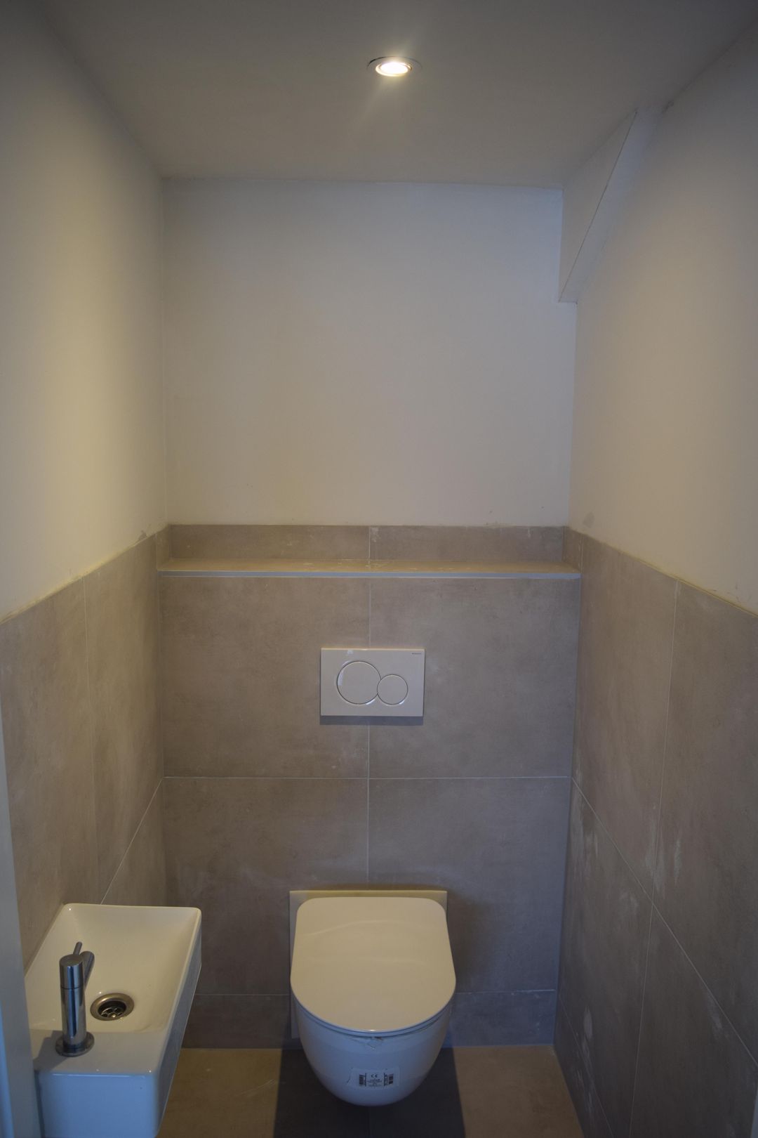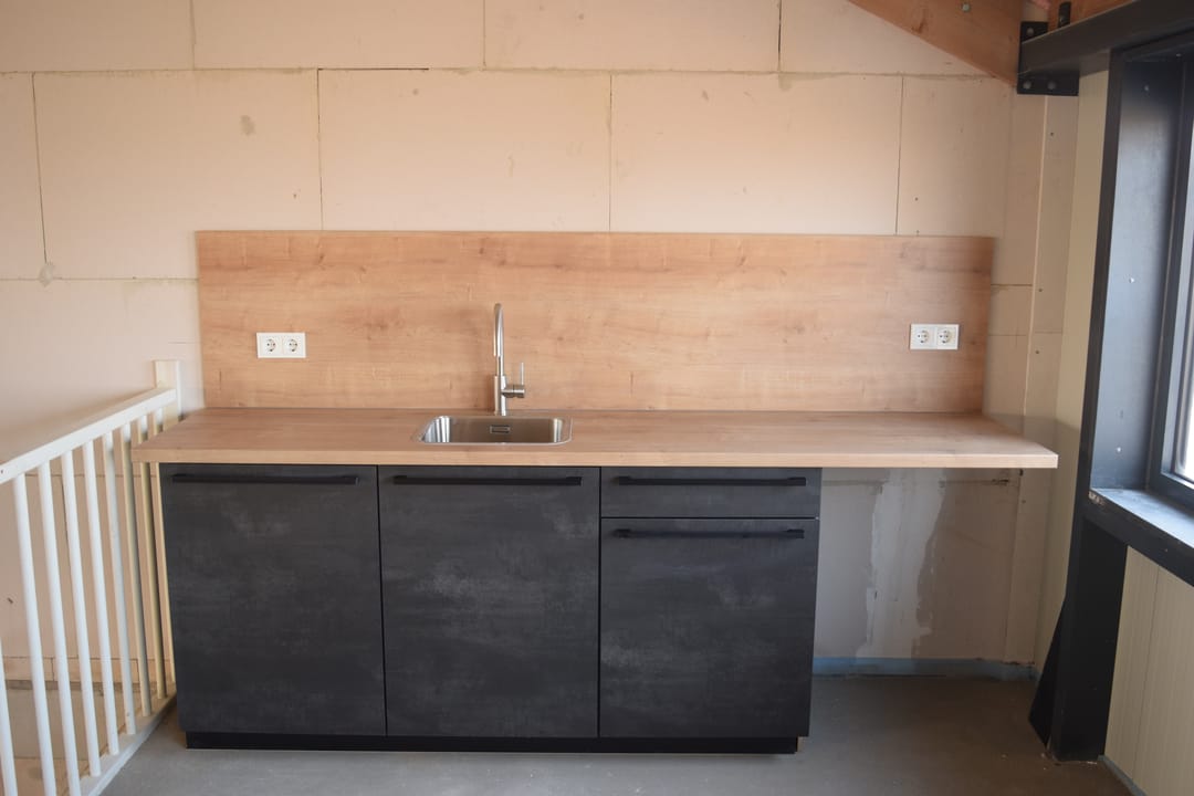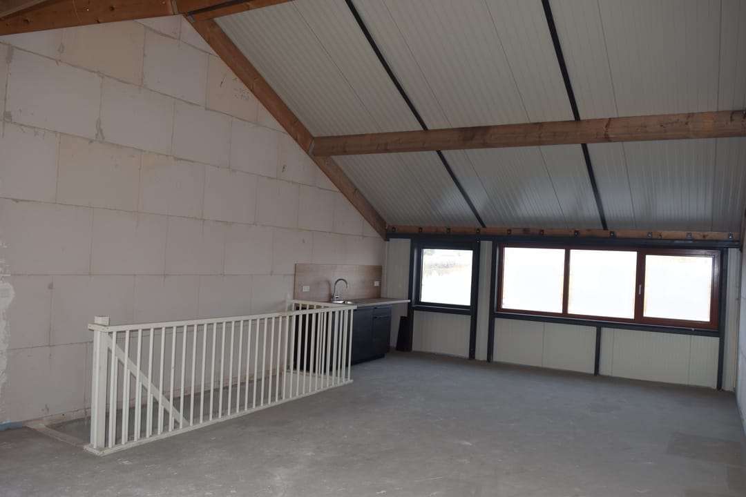 Trapopgang naar een open ruimte van ca. 55 m² met een nokhoogte van ca. 4,4 m. Voorzien van een toilet met fontein, een keukenblok met close-in boiler, een airco en verlichtingsarmaturen.