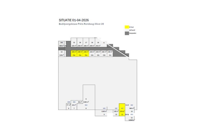 - 35T bedrijfsruimte/kantoor/showroom (aan de voorzijde van het gebouw) 270 m² € 96,- p/m² per jaar excl. BTW