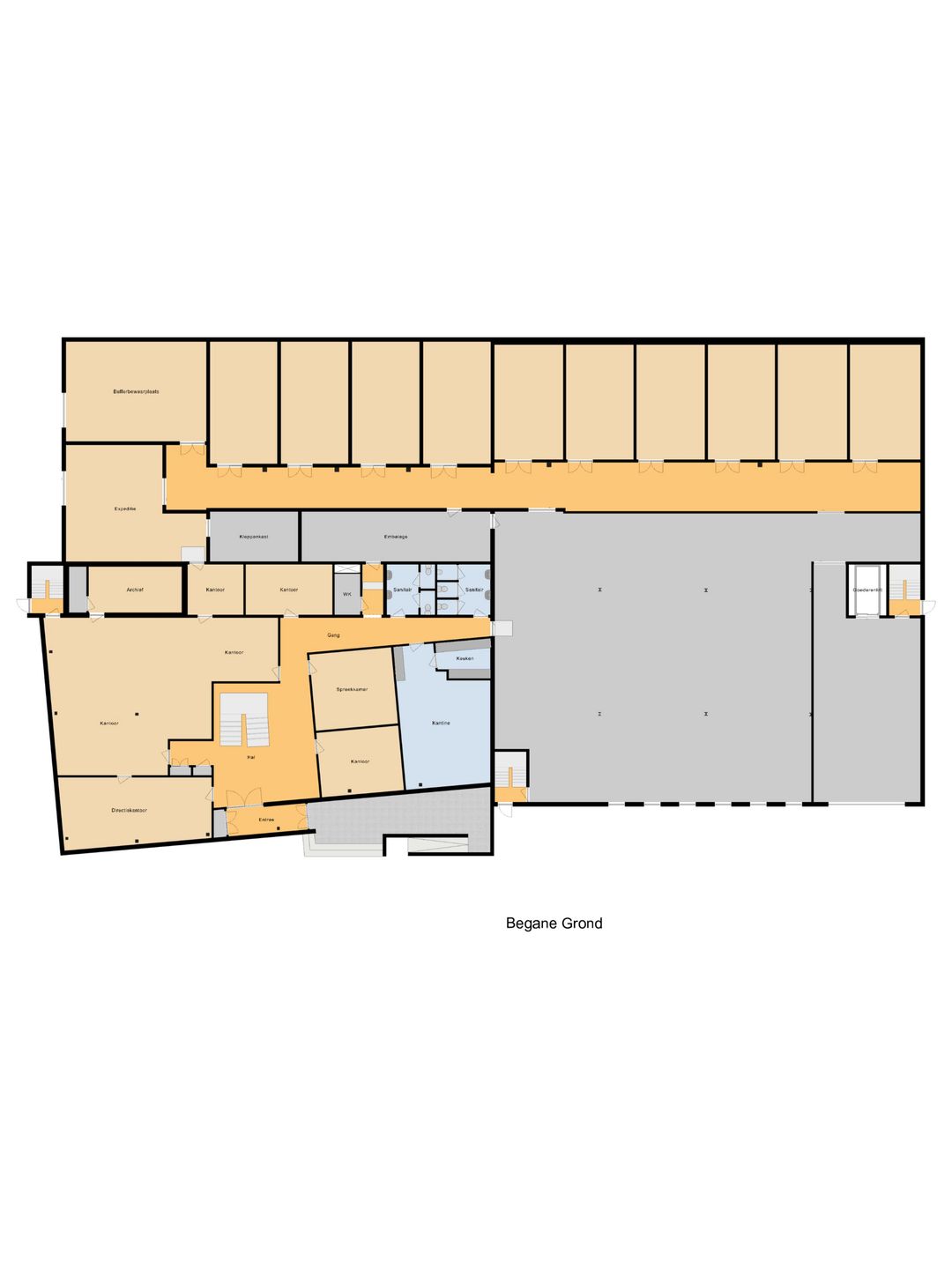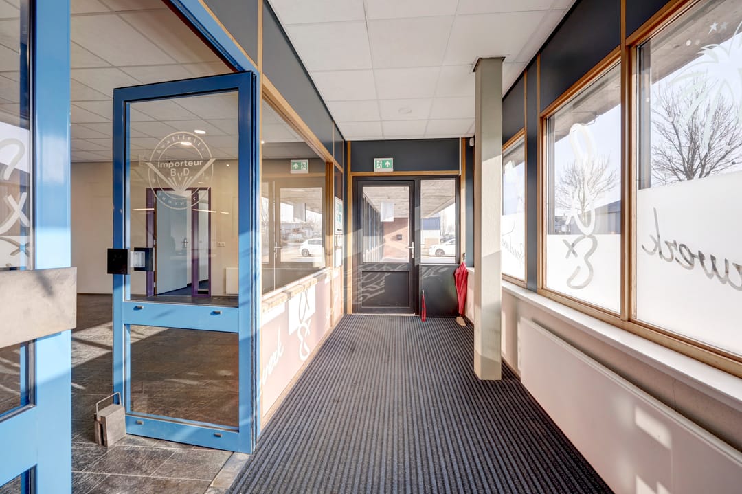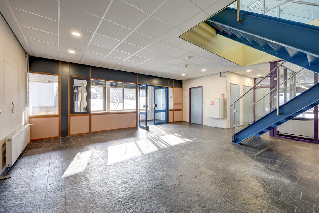 Prachtige overdekte entree met ruime en lichte hal, welke mooi is vormgegeven door vide, trappenhuis en raampartijen. Ingang naar de receptie en kantoorruimte met 5 kantoorkamers, archiefruimte, 2 dubbele toiletgroepen en kantine met keuken. Doorgang naar de bedrijfshal met emballageruimte voorzien van lift naar de verdieping en elektrisch bedienbare overheaddeur. Dubbele doorgang naar de aanliggende hal met aansluitende bunkerruimten.