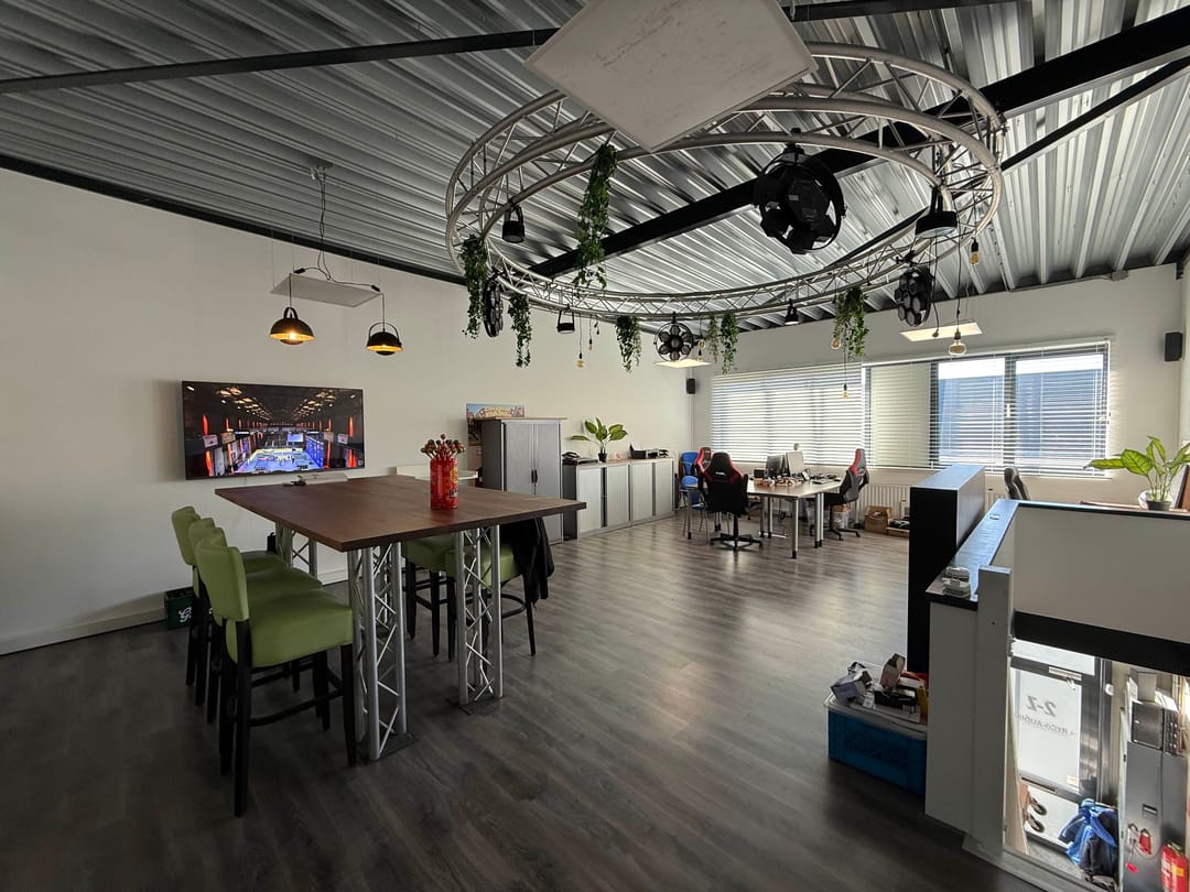 Entree, open bedrijfsruimte met toilet, trapopgang naar verdieping (kantoorruimte).