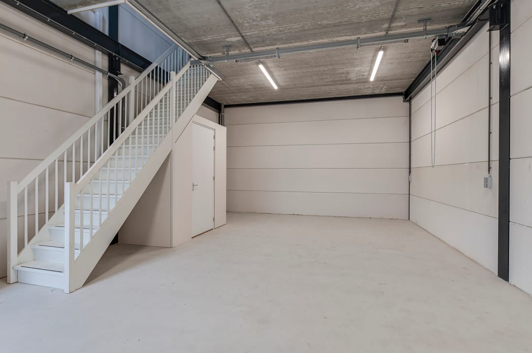 open bedrijfsruimte op de begane grond met meterkast, trapopgang en luxe afgewerkte toilet onder de trap. De bedrijfsruimte is te bereiken middels een loopdeur en een elektrisch bedienbare overheaddeur.