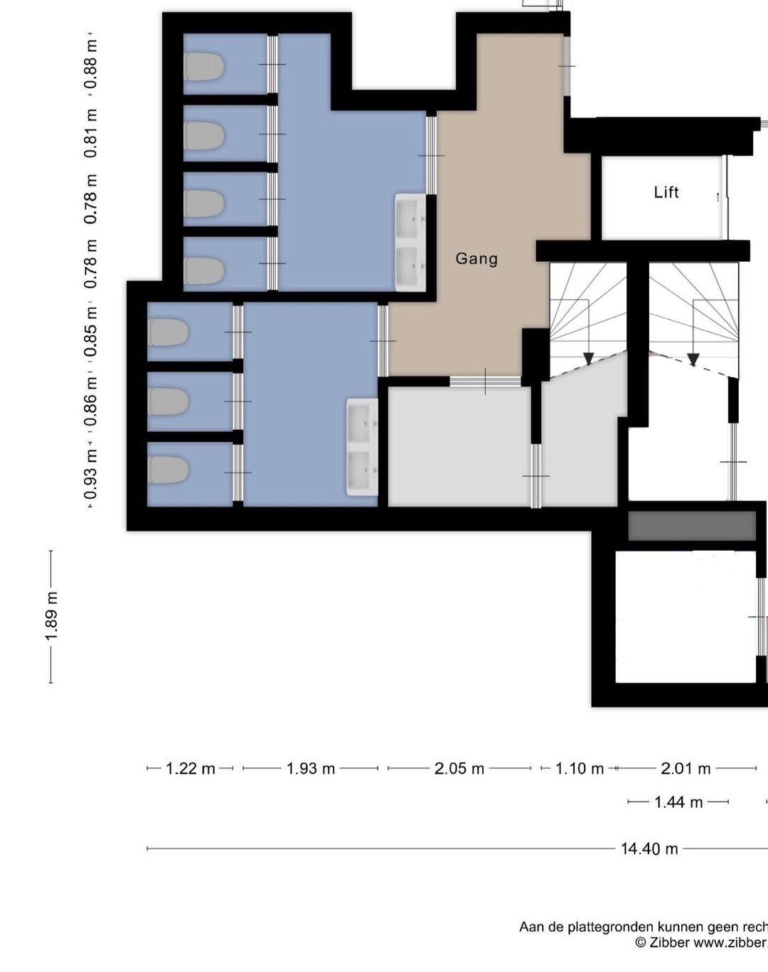 De eerste verdieping meet ca. 450 m2 en de tweede verdieping ca. 340 m2, inclusief de entree, verkeersruimte en het gebruik van de toiletgroep in het souterrain bedraagt de totale metrage ca. 825 m2 BVO.