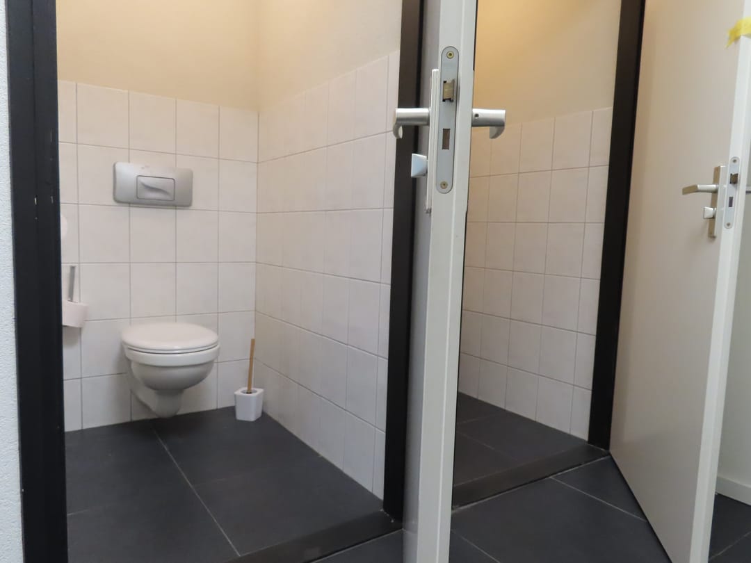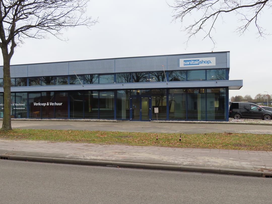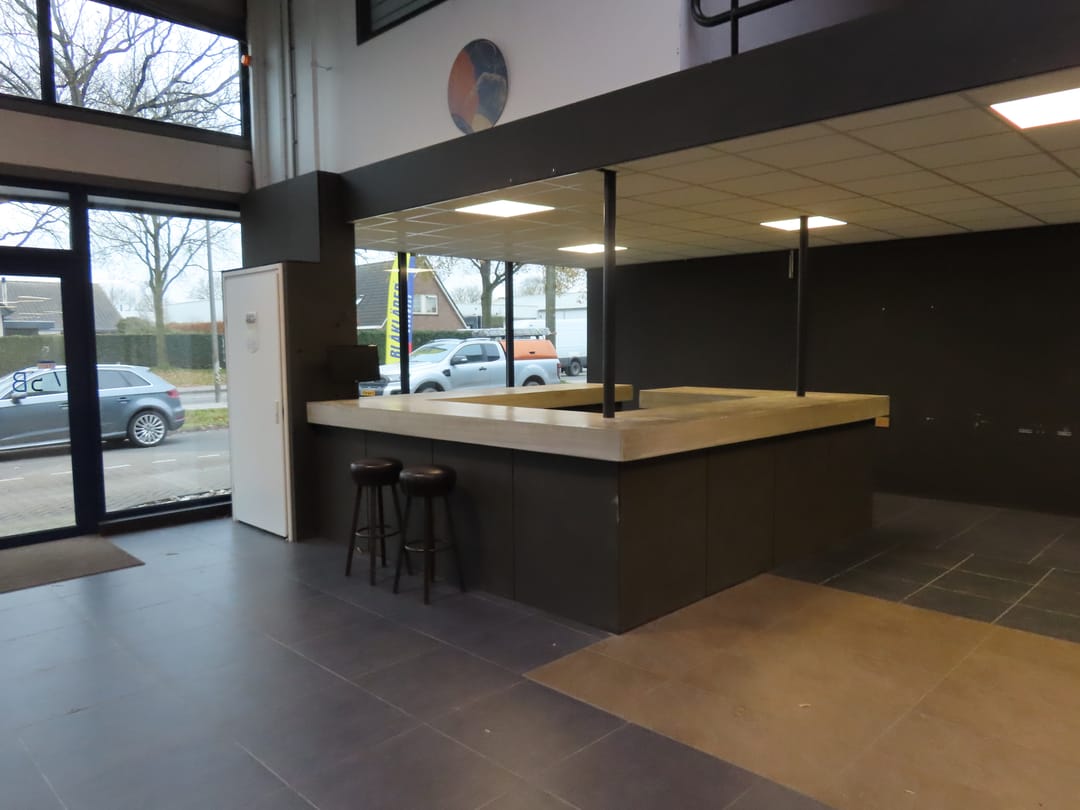 De showroom/magazijn, kantoor en de sanitaire voorzieningen representatief.