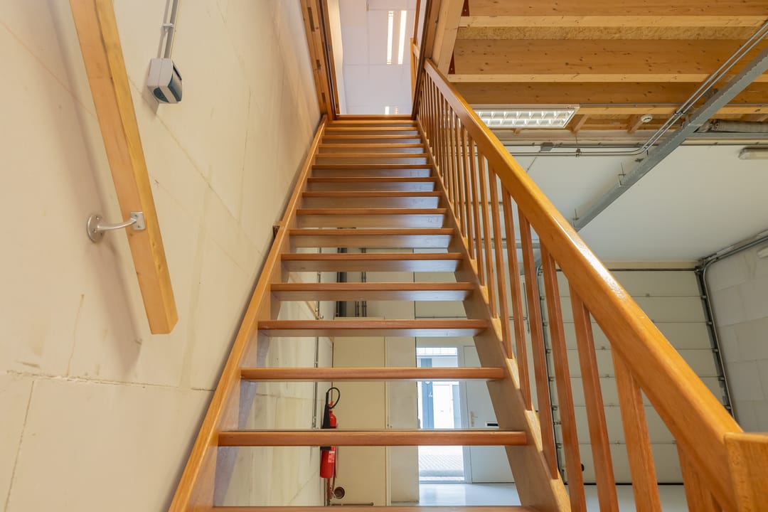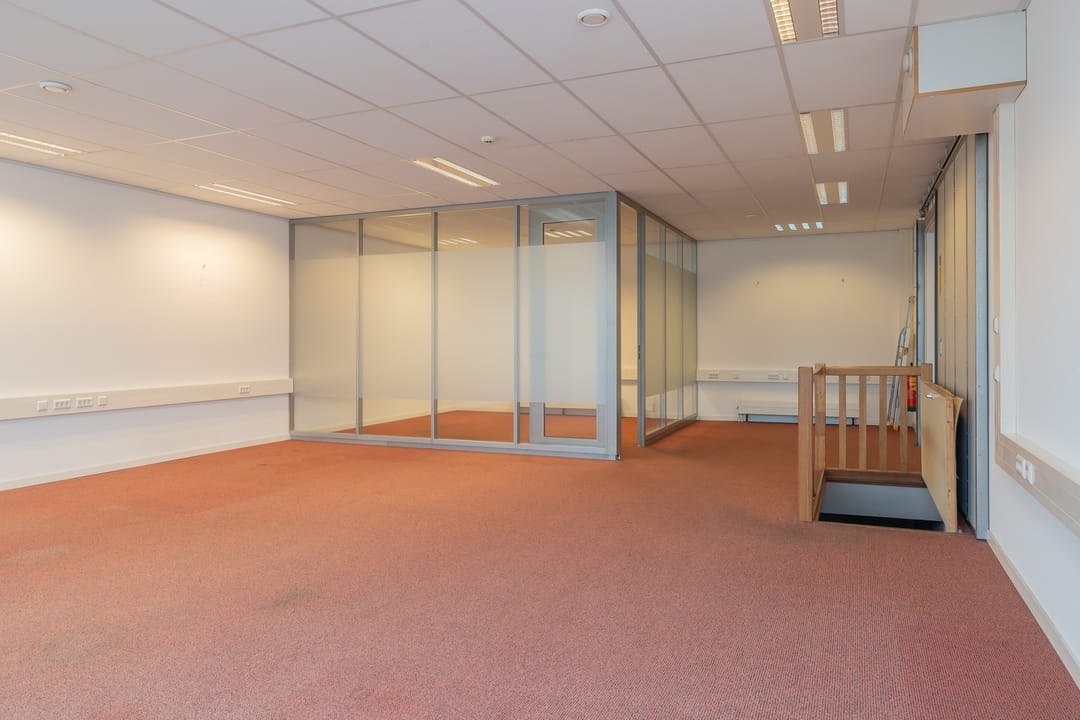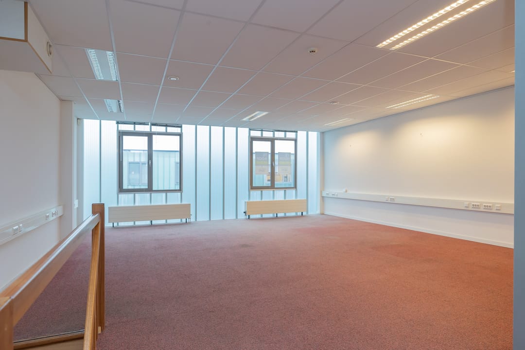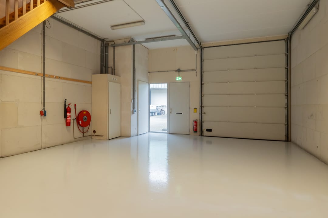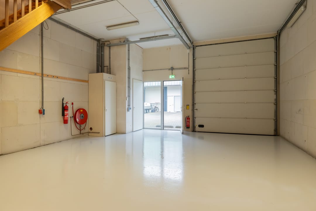 Entree middels overheaddeur of separate loopdeur naar de ruime open bedrijfsruimte met gecoate betonvloer, aparte toiletruimte met fontein en hardhouten trap met toegang naar de 1e verdieping. Op de 1e verdieping bevindt zich een open kantoorruimte voorzien van o.a. vloerbedekking, een systeemplafond met verlichtingsarmaturen, kabelgoten, radiatoren, te openen ramen en een spreekkamer met glazen wanden.