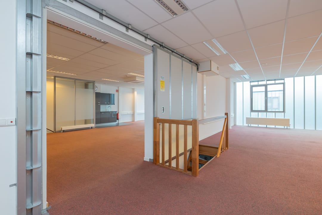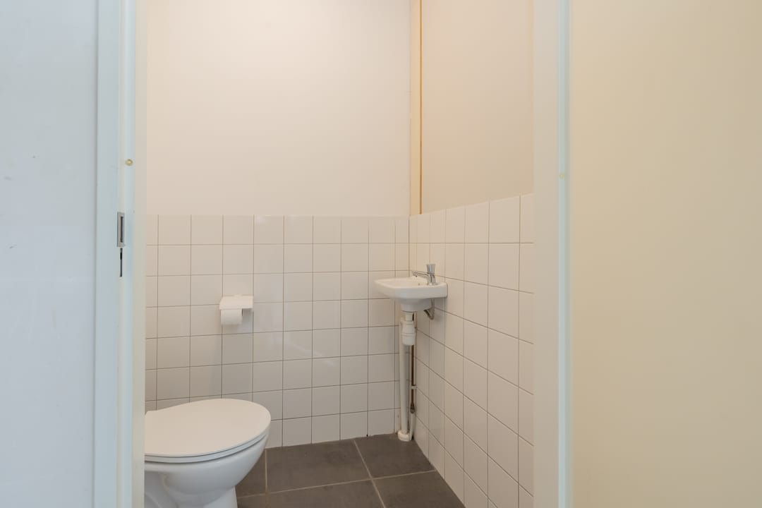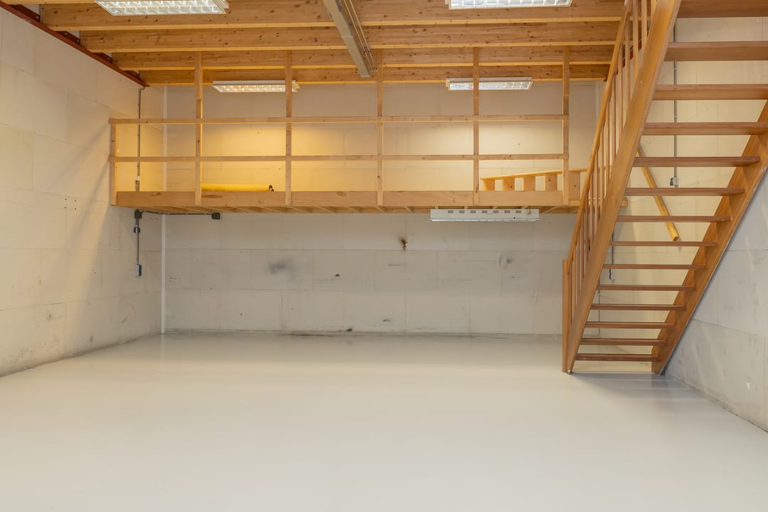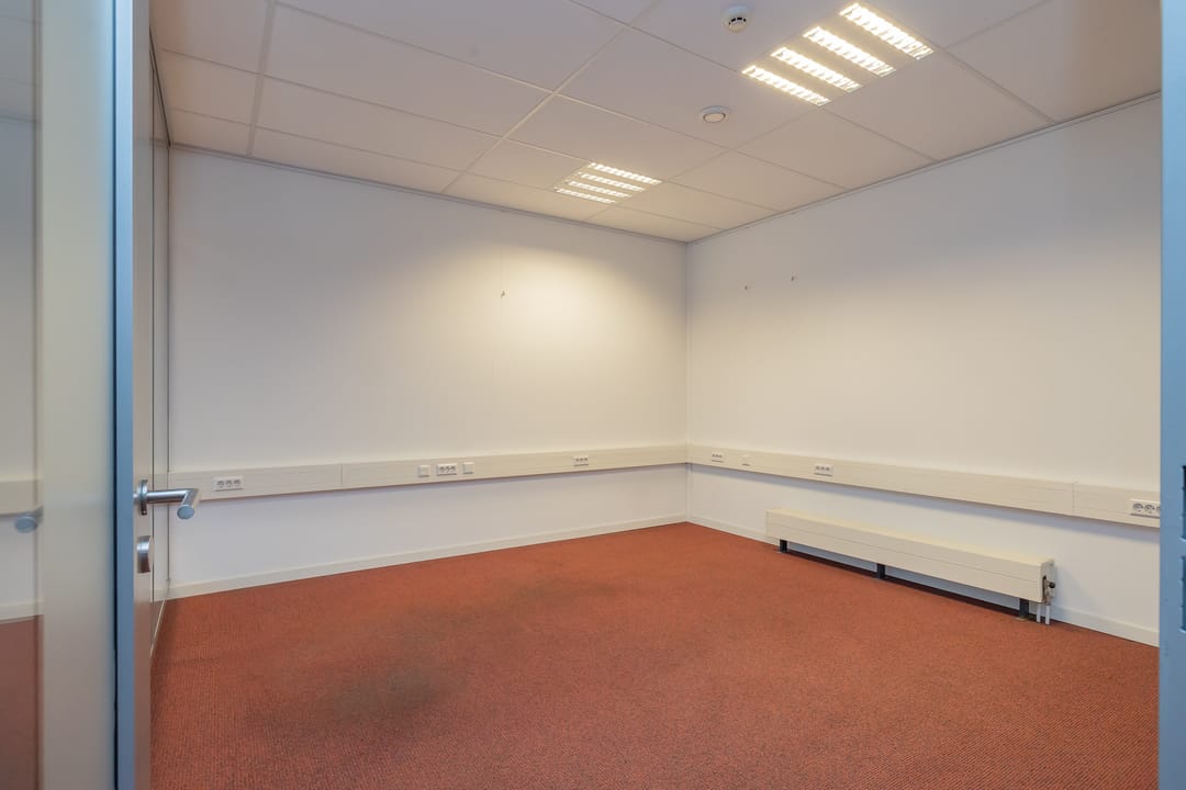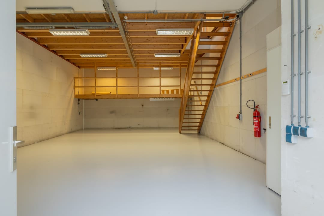 Entree middels overheaddeur of separate loopdeur naar de ruime open bedrijfsruimte met gecoate betonvloer, aparte toiletruimte met fontein en hardhouten trap met toegang naar de 1e verdieping. Op de 1e verdieping bevindt zich een open kantoorruimte voorzien van o.a. vloerbedekking, een systeemplafond met verlichtingsarmaturen, kabelgoten, radiatoren, te openen ramen en een spreekkamer met glazen wanden.