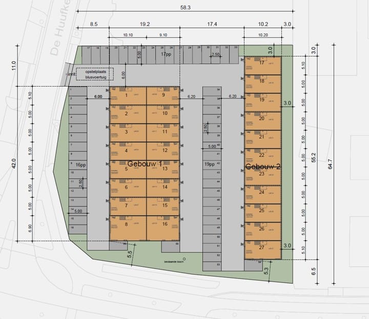 De unit beschikt over twee (2) parkeerplaatsen op het gezamenlijke parkeerterrein.