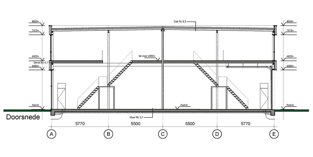 - gevels begane grond metselwerk met daarboven sandwichpanelen, geïsoleerde gevelbeplating (Rc-4,7) en deels hout sierelementen;