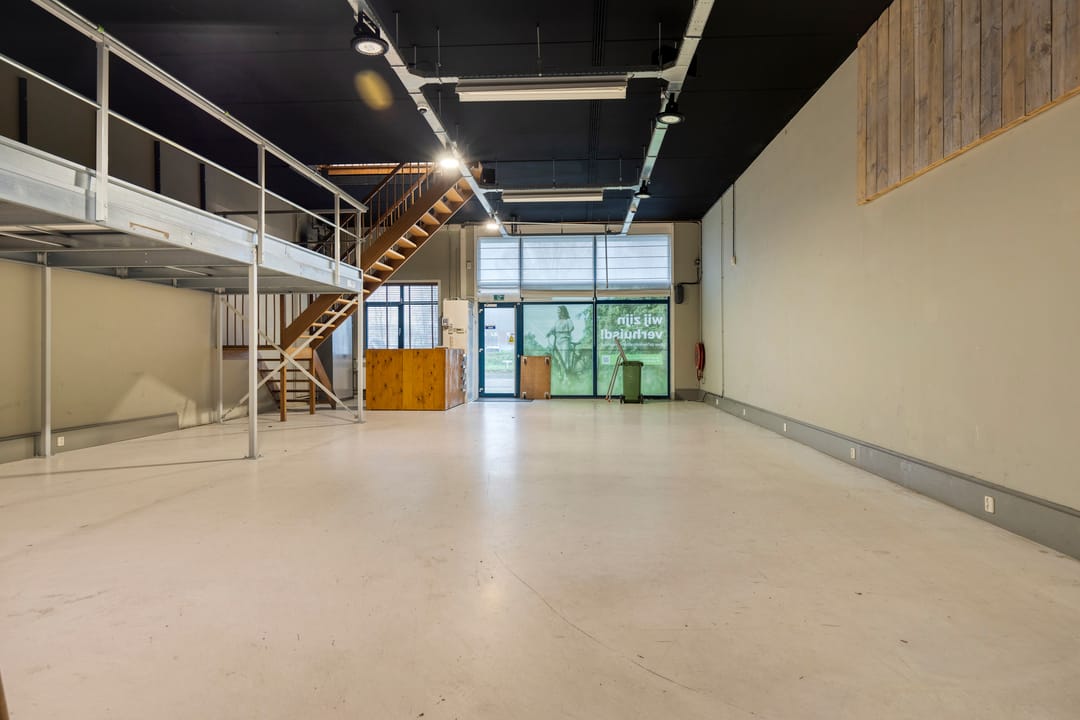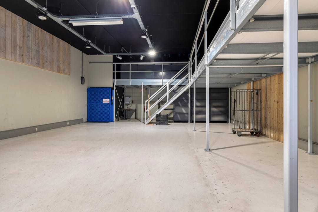 Entree via de loopdeur naar een grote open bedrijfsruimte met hoge plafonds en een ruime vide. De aanwezige goederenlift (max. 1.000 kg) maakt het verplaatsen van materialen eenvoudig. Vanuit de bedrijfsruimte geeft een vaste trap toegang tot de eerste verdieping.