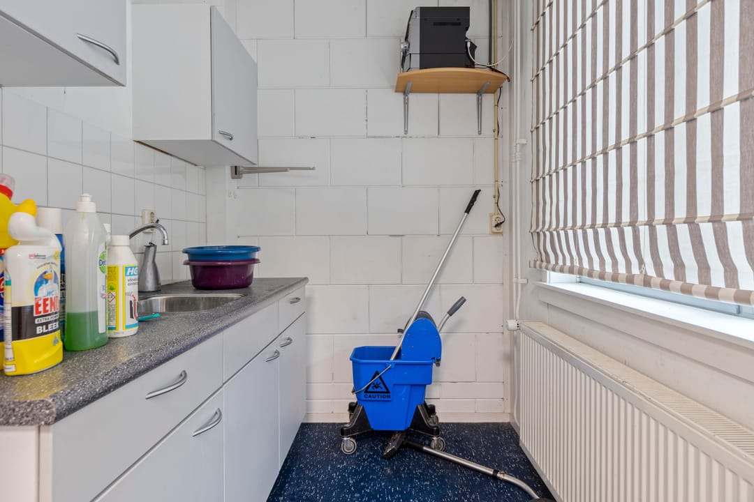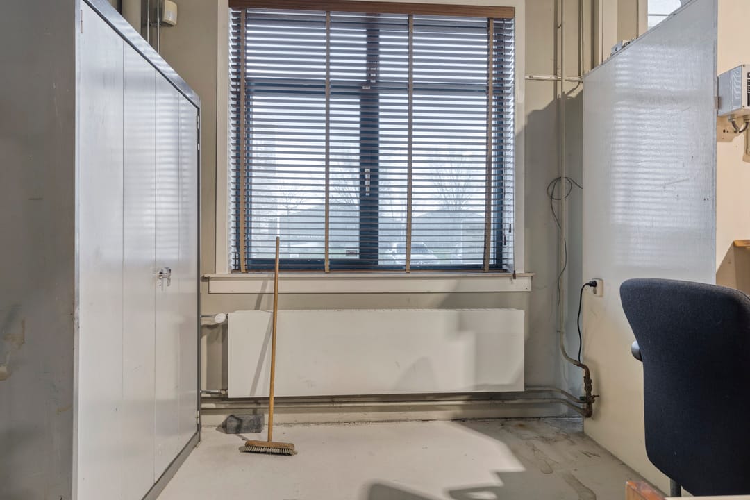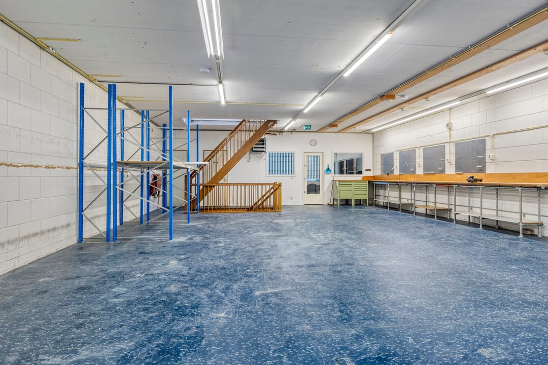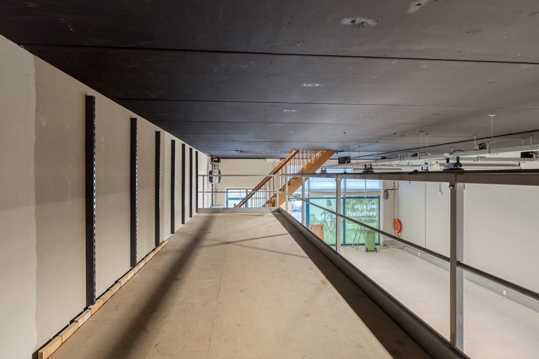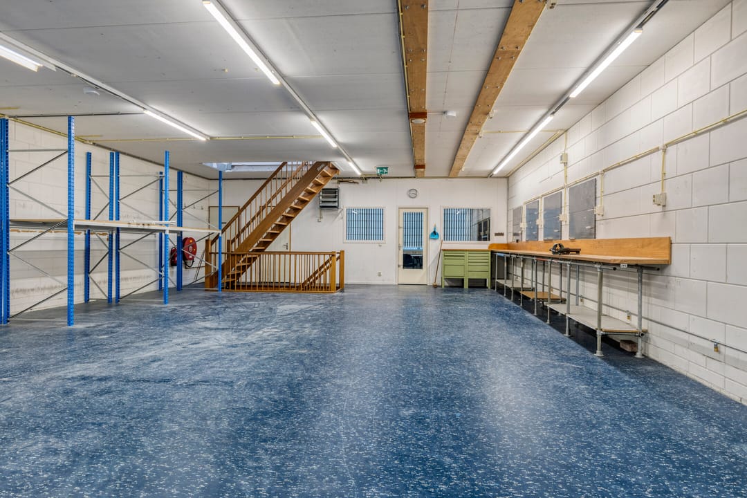 Trapopgang naar de eerste verdieping met toegang tot de bedrijfsruimte. Op deze verdieping bevinden zich tevens het toilet, een kast met de opstelling van de cv-ketel, een pantry met spoelbak, en een kantoorruimte met daglicht. Daarnaast is er een ruime open werkruimte met werkbanken en opslagmogelijkheden.