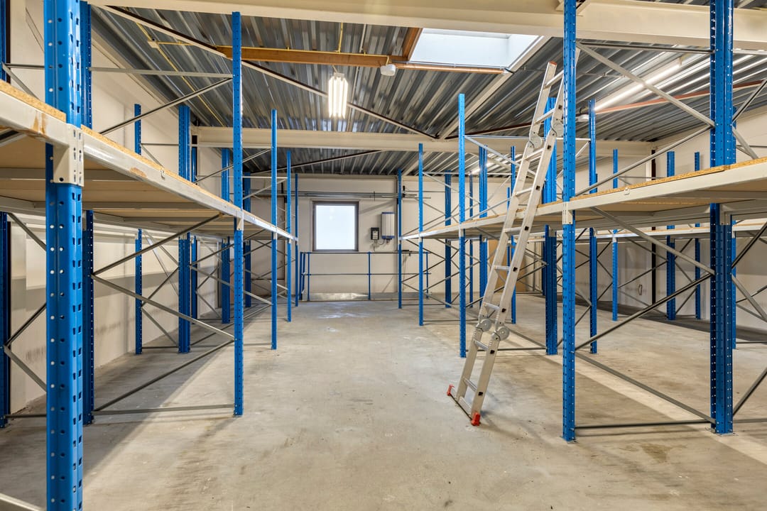 Overloop met toegang tot een royale bedrijfsruimte, voorzien van een lichtkoepel waardoor er extra daglicht binnenvalt. De ruimte is ingericht met ruime stellingen, ideaal voor opslag. Vanuit deze bedrijfsruimte is er toegang tot een tweede, kleinere bedrijfsruimte.
