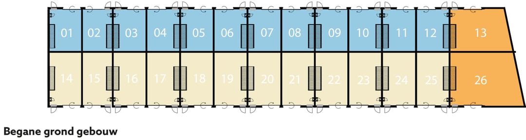 Deze bedrijfsunits zijn voorzien van een elektrisch bedienbare overheaddeur op de begane grond met een breedte van 350 cm en een hoogte van 340 cm en een separate loopdeur. De begane grond heeft een vrije hoogte van circa 370 cm. De verdieping is bereikbaar middels een houten trap. De hoekunit (bouwnummer 1) heeft zijramen op de 1e verdieping.