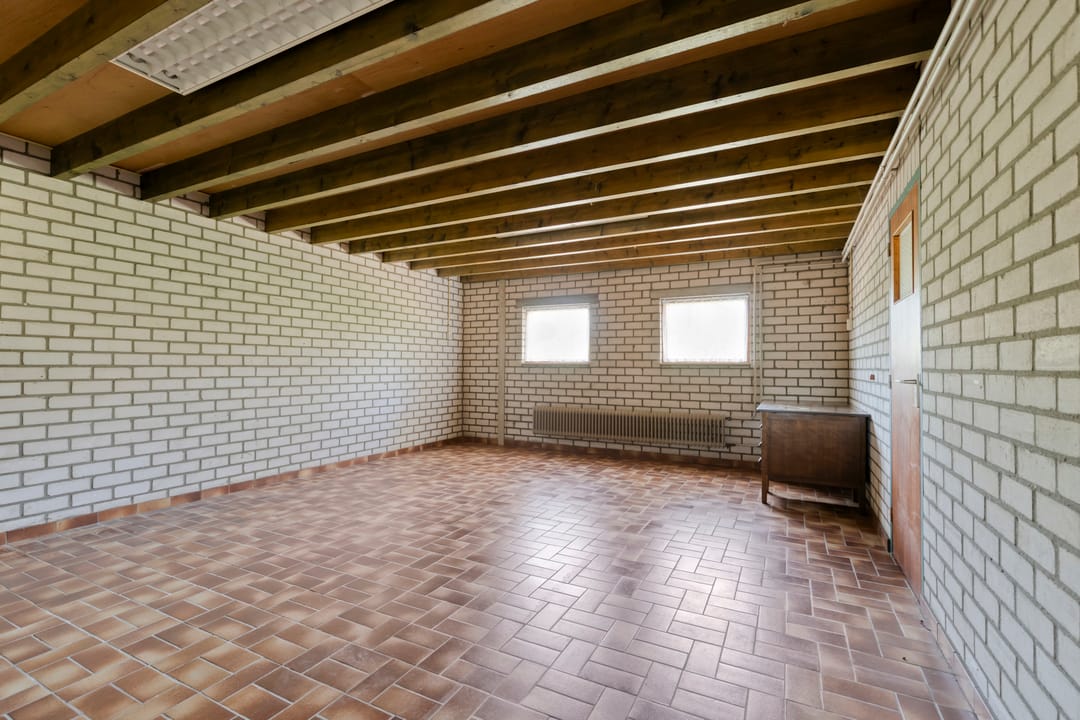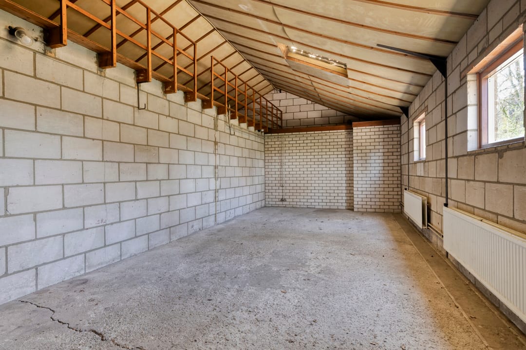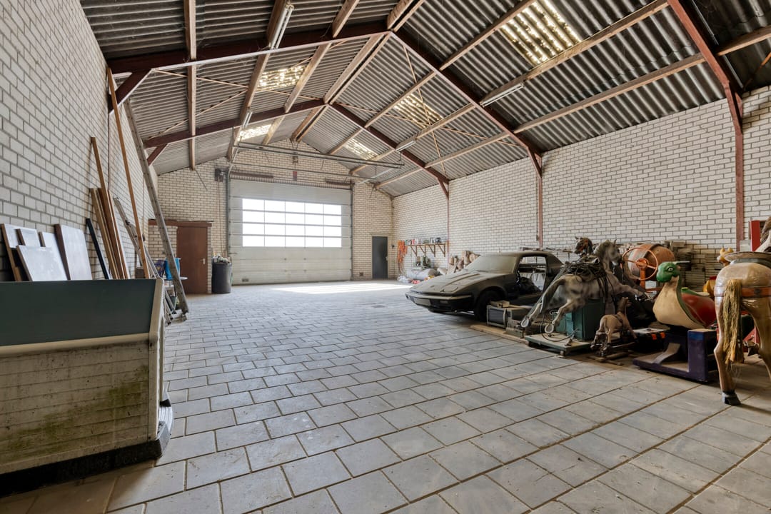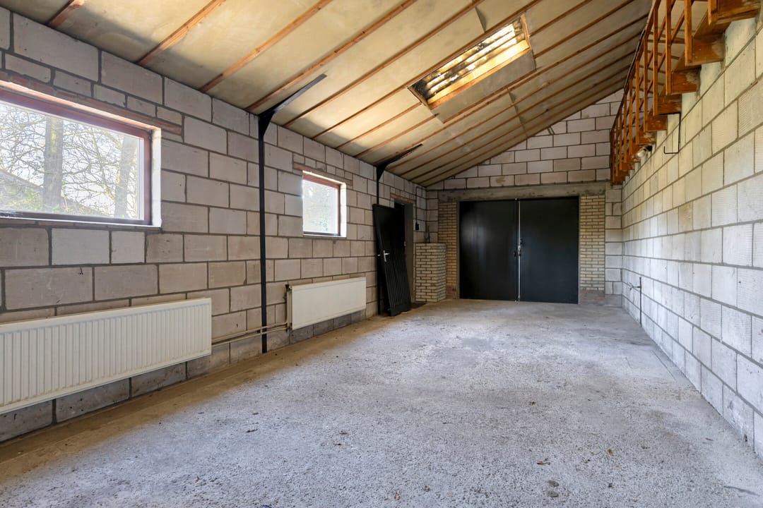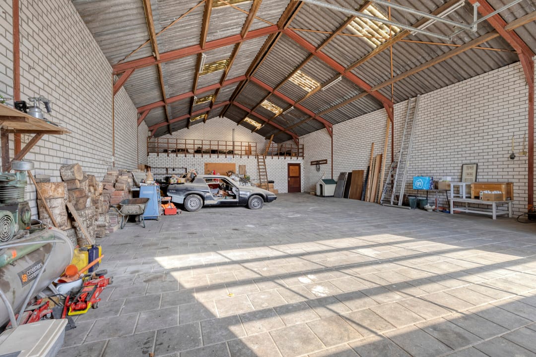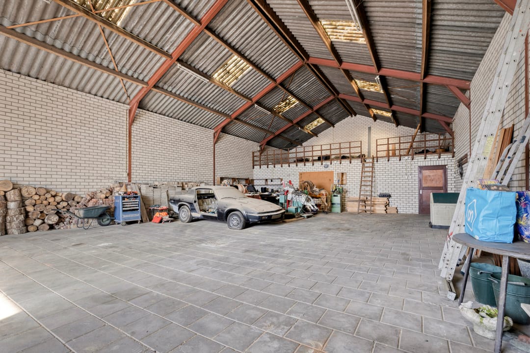 Verder doorlopend bereikt u twee ruime werkruimten, die in verbinding staan met de grote garage-/loodsruimte. Deze ruimte leent zich uitstekend voor opslag, werkplaats of stalling van voertuigen.